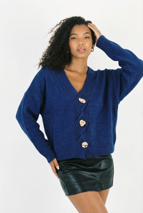 Pulover cu nasturi decorativi impletitura decorativa pe piept si decolteu in V, albastru electric