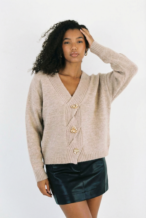 Pulover bej, moale si fin cu trei nasturi mari aurii, oversize
