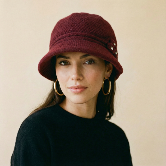Caciula stil palarie bordo cu bor si decoratiune laterala argintie, captusita in interior