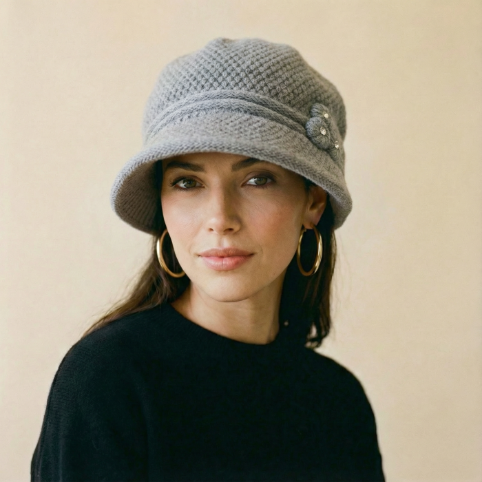 Caciula stil palarie gri deschis cu bor si decoratiune laterala argintie, captusita in interior