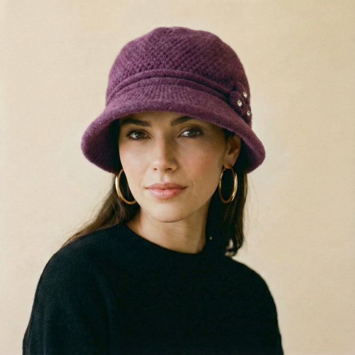 Caciula stil palarie mov cu bor si decoratiune laterala argintie, captusita in interior