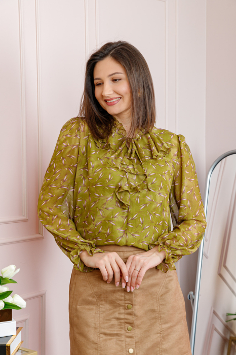 Bluza eleganta verde olive Lucienne cu imprimeu lila si jabou