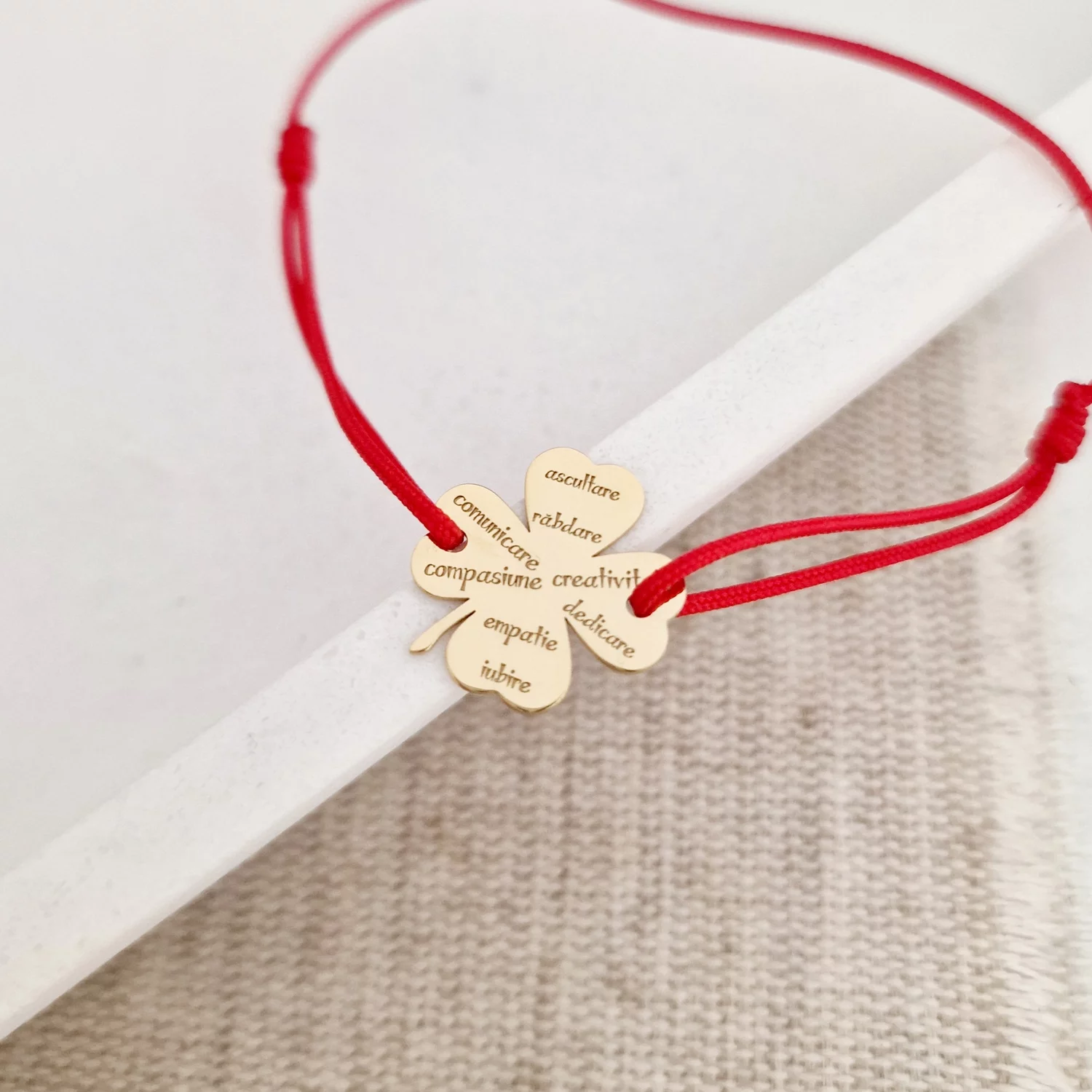 Bratara personalizata - Trifoi cu nume - Argint 925 placat cu Aur Galben 18K- Snur reglabil, diverse culori