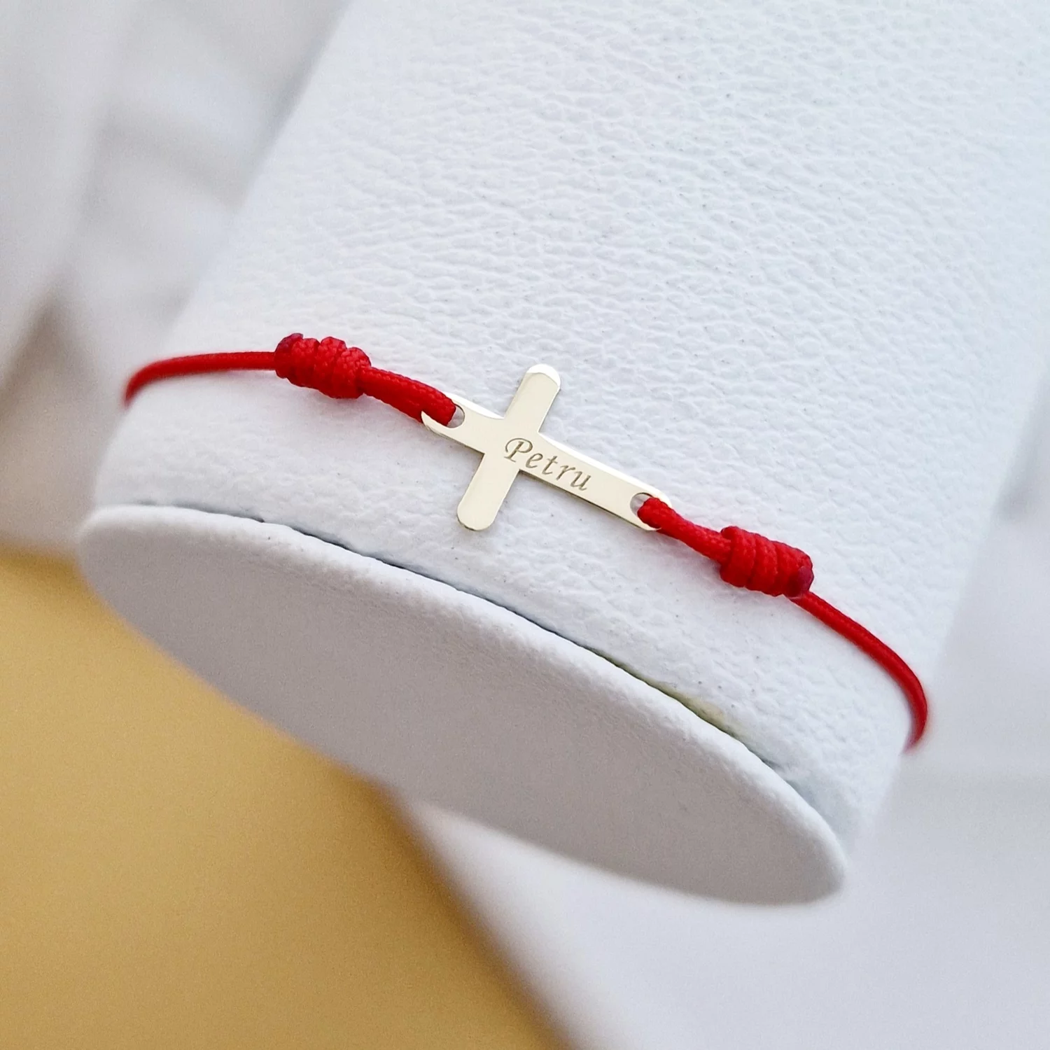 Bratara Cruciulita de 15 mm - Nume gravat - Aur Galben 9K - Snur reglabil de diverse culori