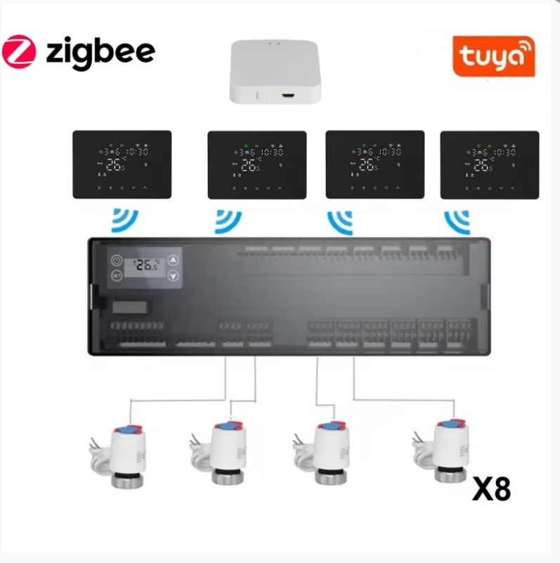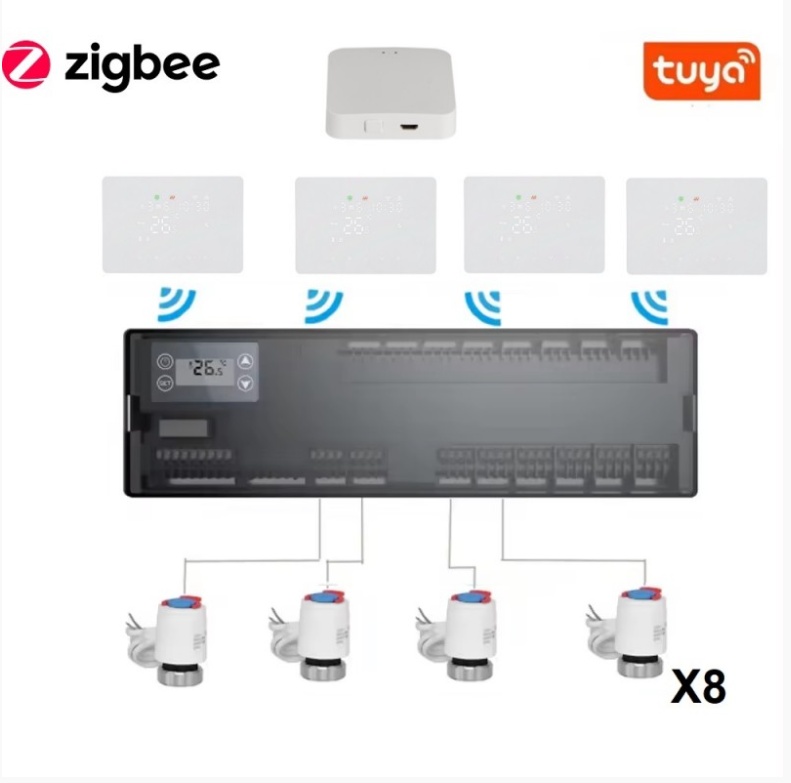 Pachet Automatizare incalzire in pardoseala wireless, Hub 8 zone, 4 termostate, 8 actuatoare,Gateway Zigbee Alb