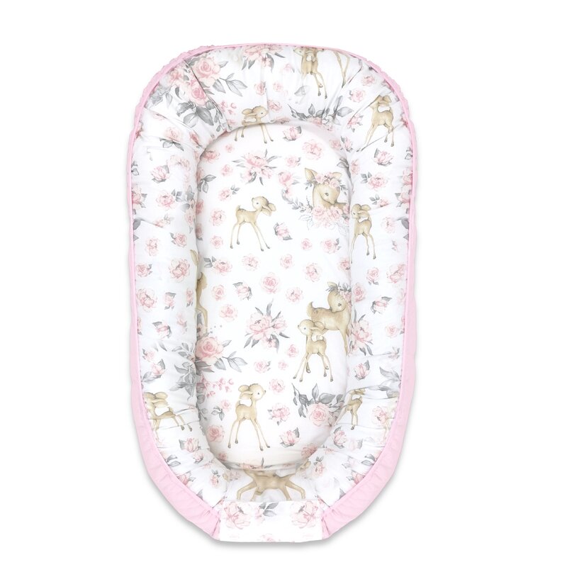 Cosulet bebelus, MimiNu, Pentru dormit, Cu doua fete, Baby Nest 105x66 cm, Husa 100% bumbac si catifea moale, Materiale certificate Oeko Tex Standard 100, Cu salteluta, Detasabila, Velvet Sweet Deer Pink