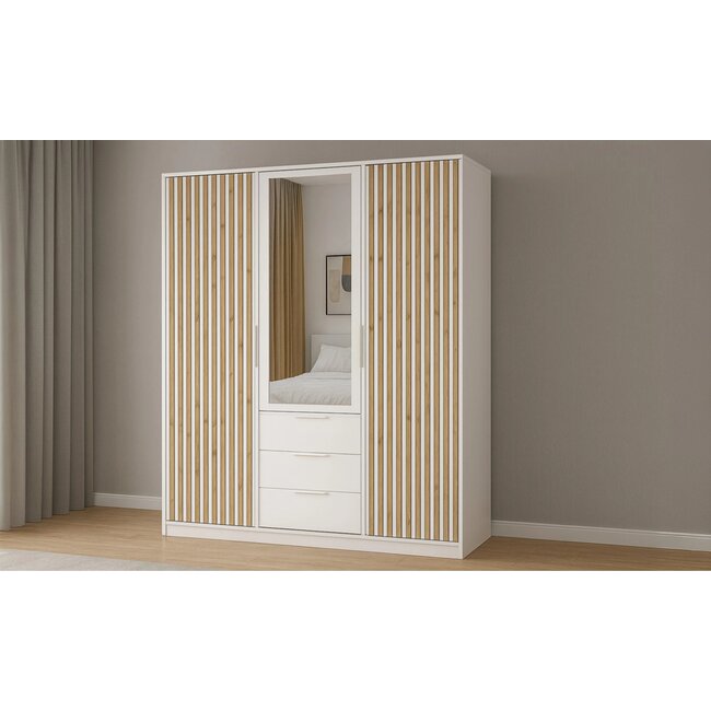 Dulap Bali D3 LUX, uși glisante cu oglindă, 3 sertare spațioase, PAL melaminat, 147x58x200 cm, Alb