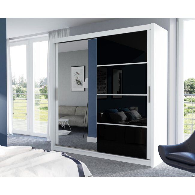 Dulap Brandon cu usi glisante si oglinda din PAL, 1,50x0,61x2,15 m, alb si negru