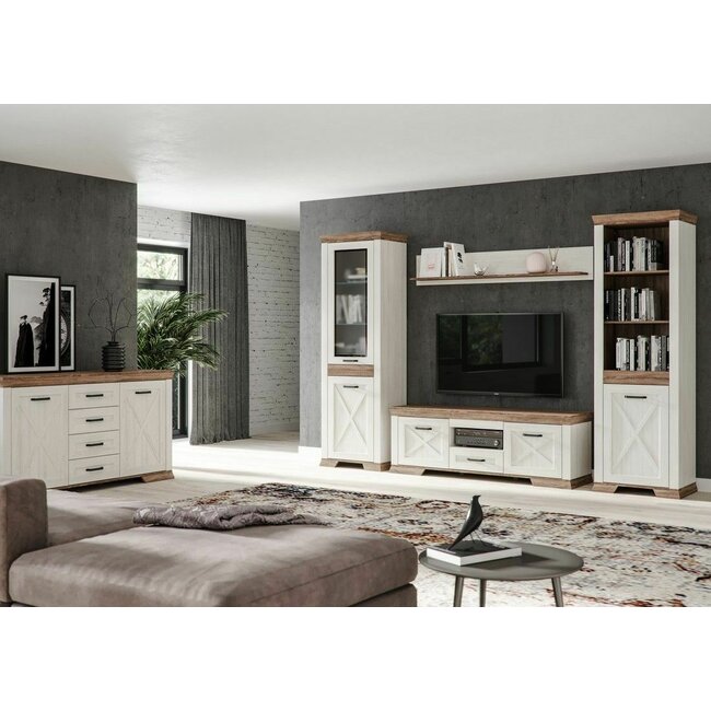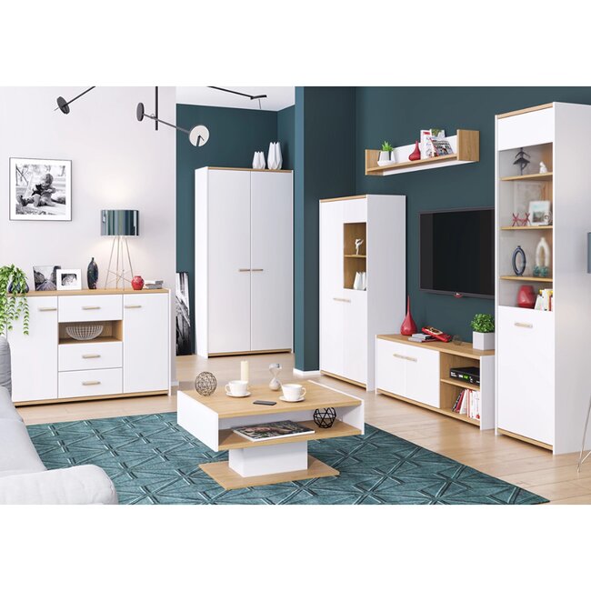 Set living Helix 1, vitrină, comodă TV și spații depozitare multiple, PAL melaminat de calitate, alb/stejar, design modern