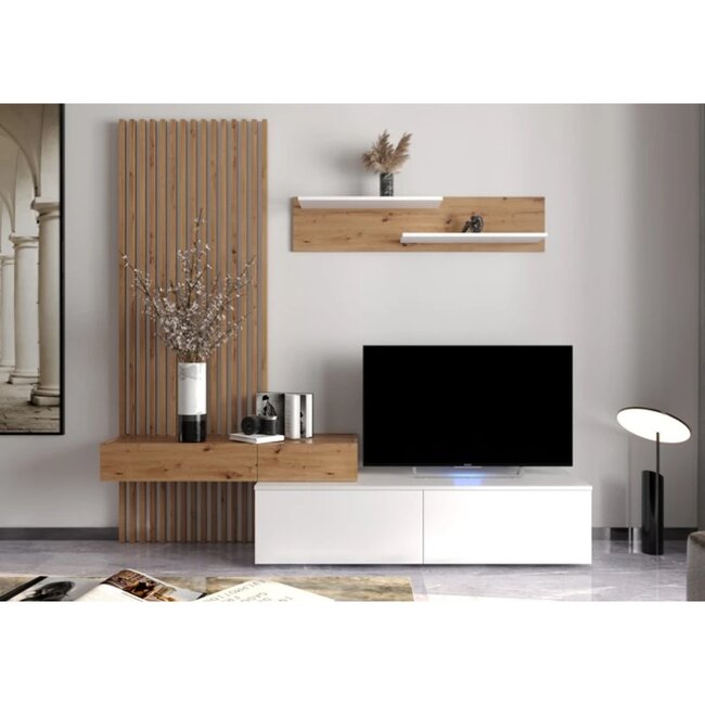 Set living Adam, mobilier modular, PAL melaminat, dimensiuni variabile, alb și stejar votan