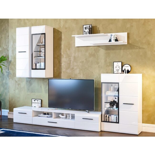 Living Marsel, Set Modular Cu Vitrină, Comodă RTV, Rafturi Și Spații Depozitare, MDF/PAL, Alb Frasin