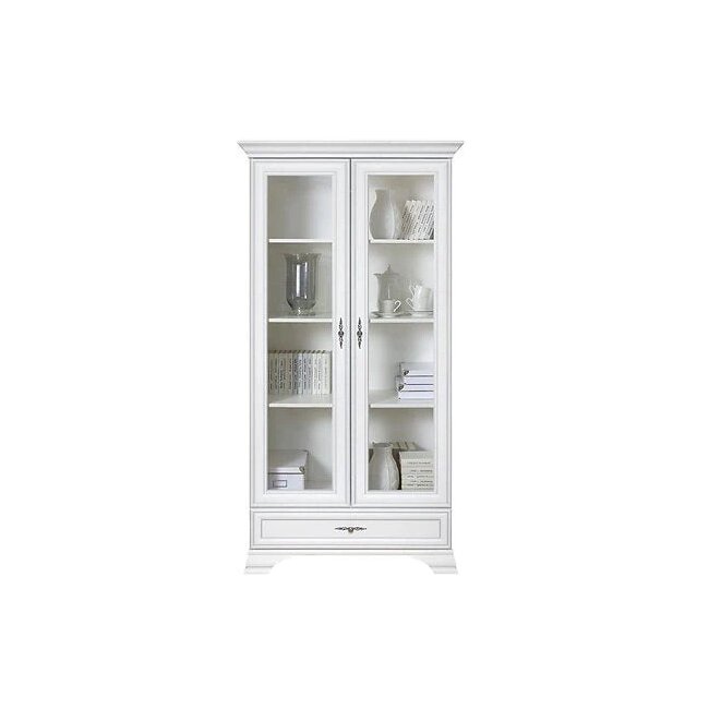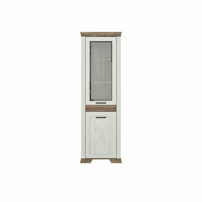 Vitrină White 1D1W, design clasic cu cornisa sculptată, MDF frezat și PAL melaminat, balamale Hafele și mânere metalice, 76x43x221 cm, frasin alb/pin argintiu