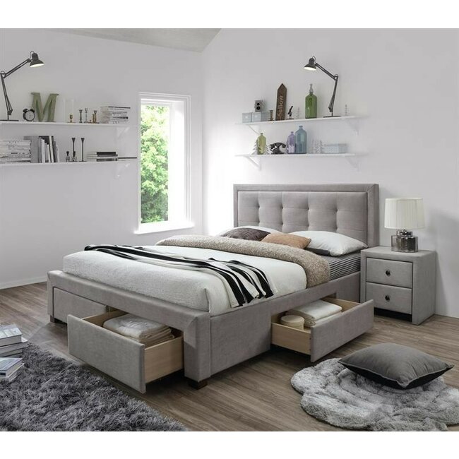 Pat Evora, cu sertare laterale pentru depozitare, stofă și lemn masiv, 160x200 cm, bej