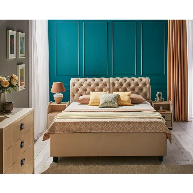 Pat Frankfurt cu spătar tapițat, stofă catifelata și ladă depozitare, 180x200 cm, bej