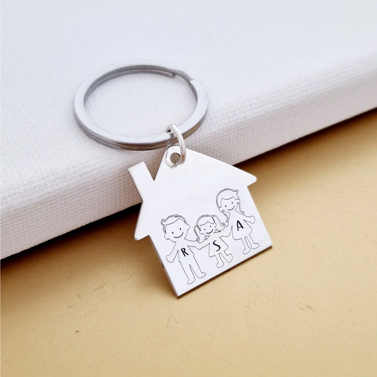 Breloc Casuta cu membri familie gravati -Mama, Tata si Fata - Argint 925, otel inoxidabil