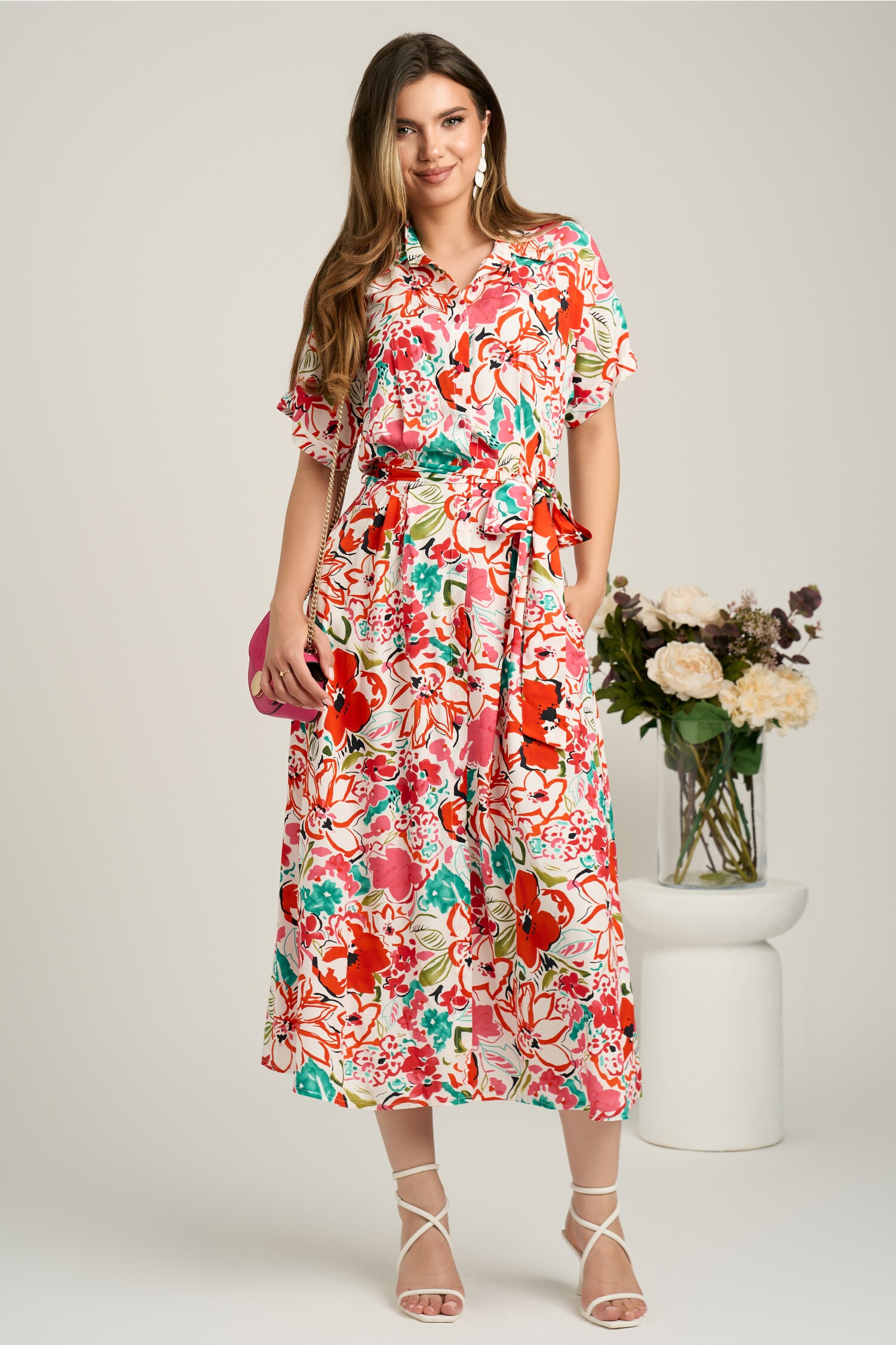 Rochie midi alba cu flori corai din viscoza in clini cu nasturi si cordon in talie