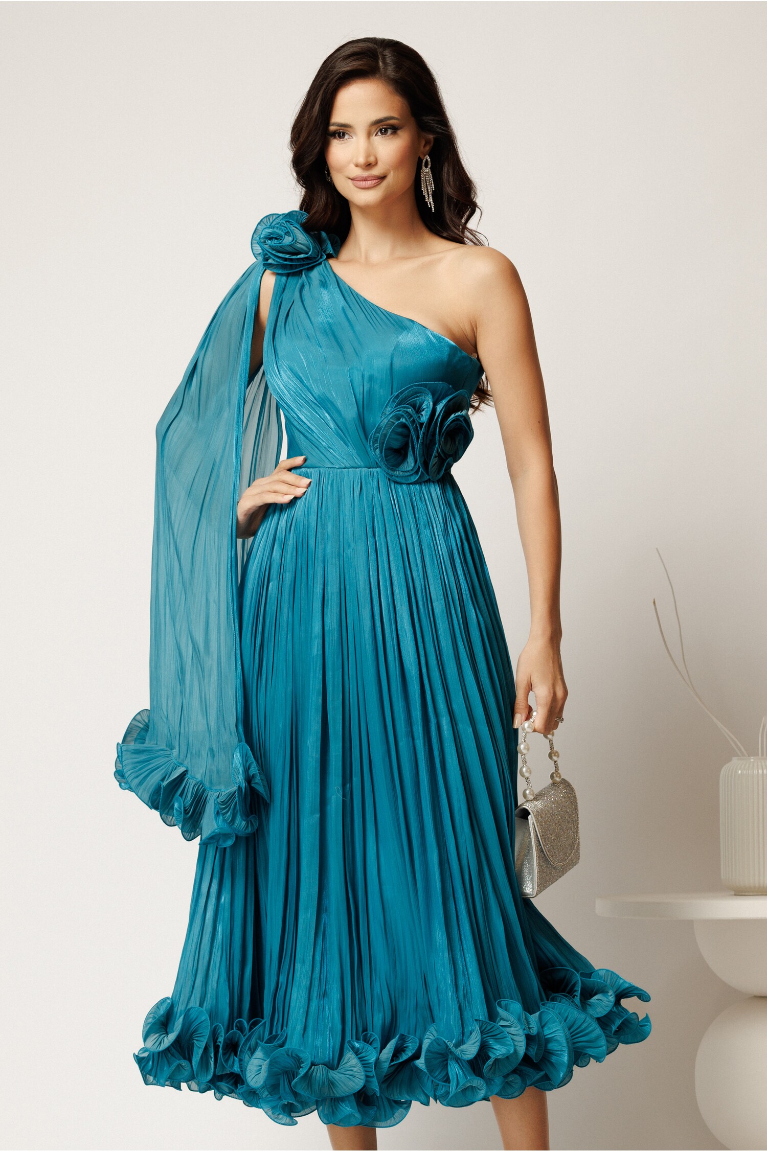 Rochie midi turcoaz din voal satinat cu volanase la baza si flori in talie si pe umar