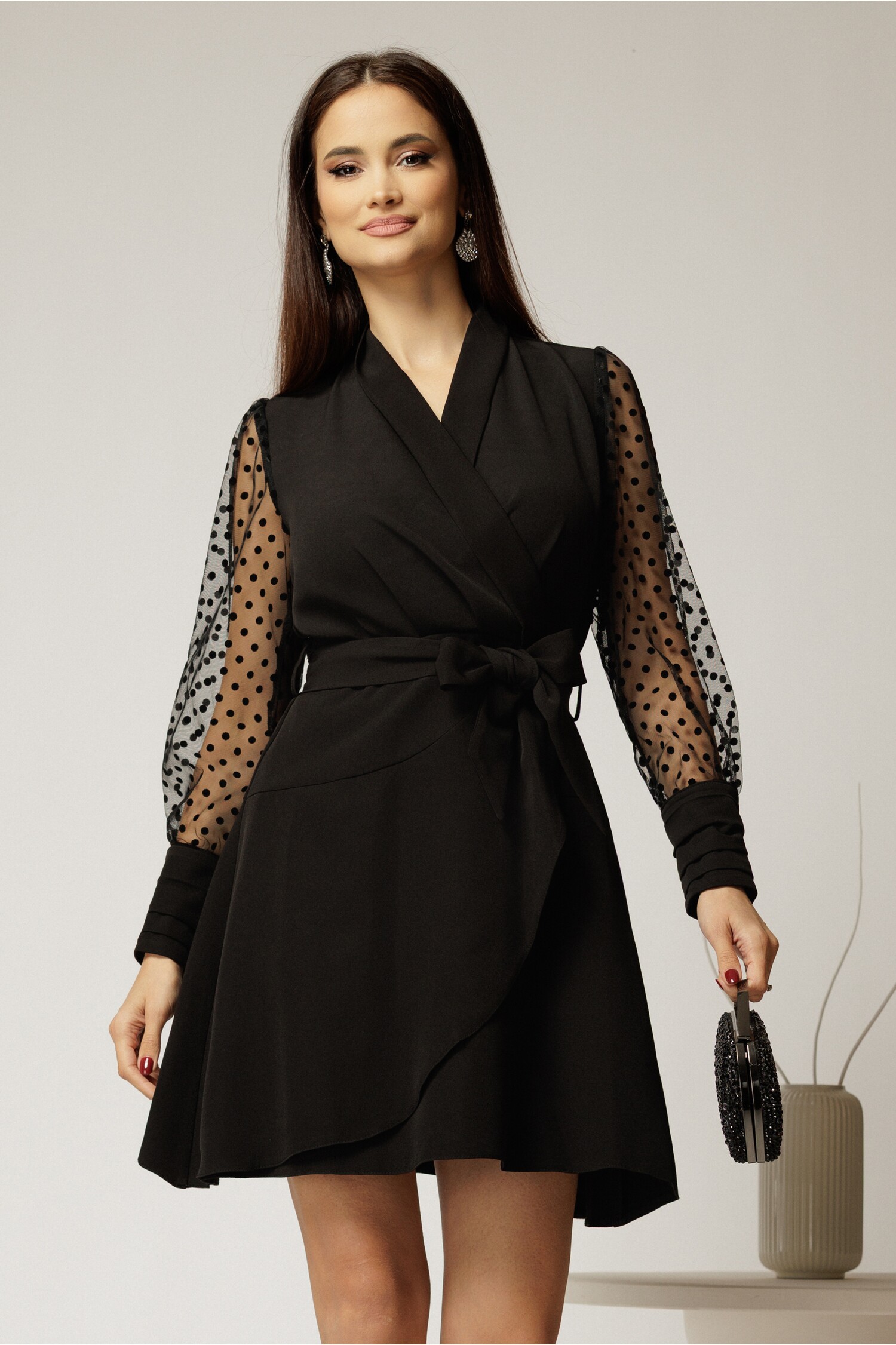 Rochie Kim neagra petrecuta cu maneci cu buline catifelate