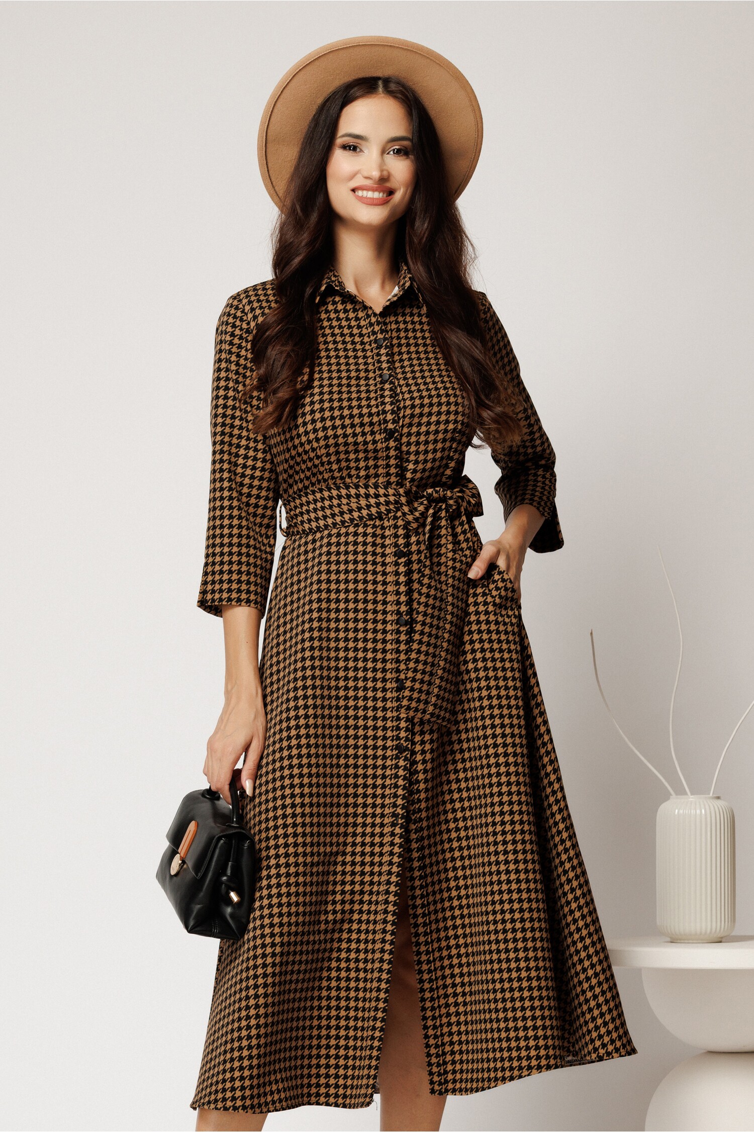 Rochie midi tip camasa maro cu imprimeuri pepit si curea in talie