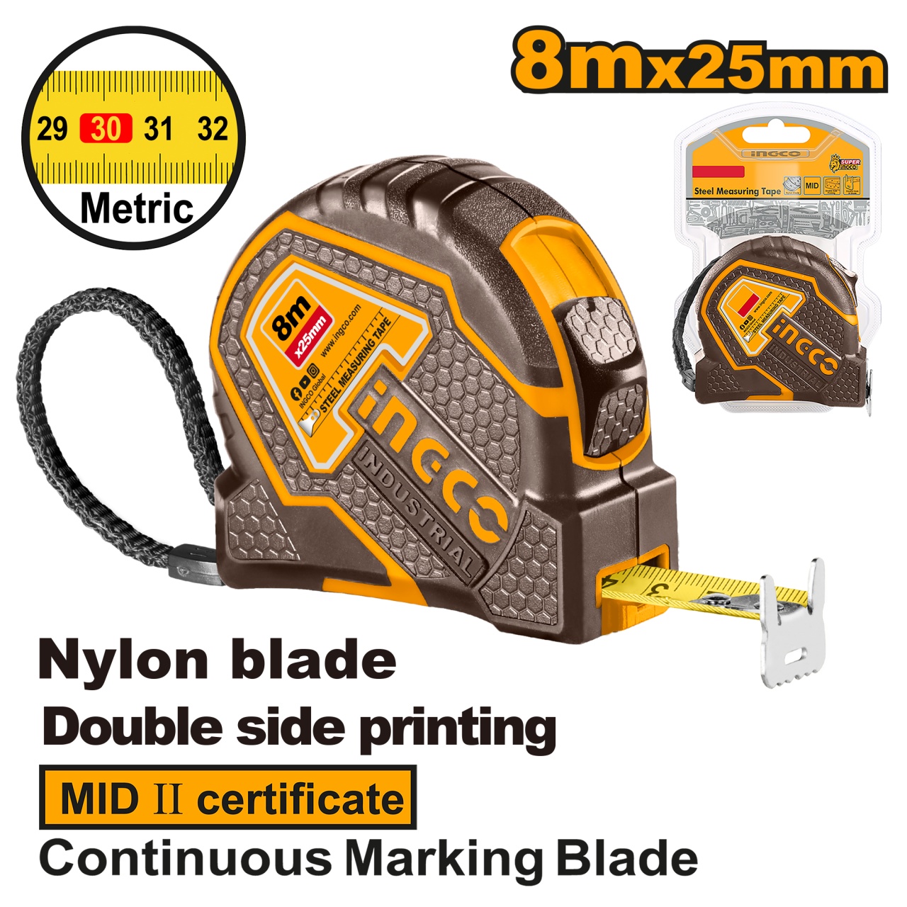 Ruleta magnetica profesionala 8m x 25mm, carcasa cauciucata, banda cu strat nylon, INGCO HSMT88081E