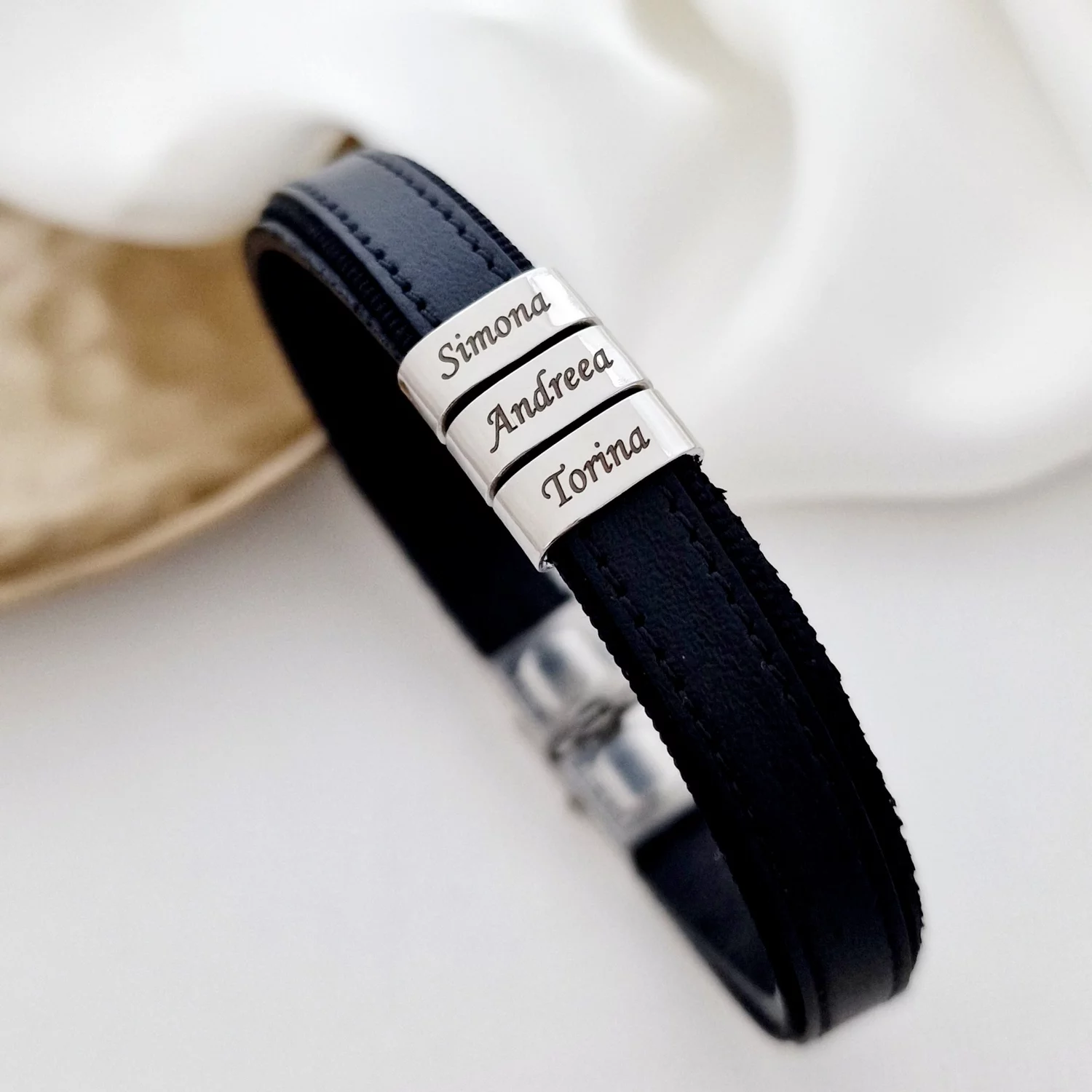 Bratara barbateasca Classic Elegance - 3 Elemente inox argintiu - Piele neagra cu inchizatoare clips din inox