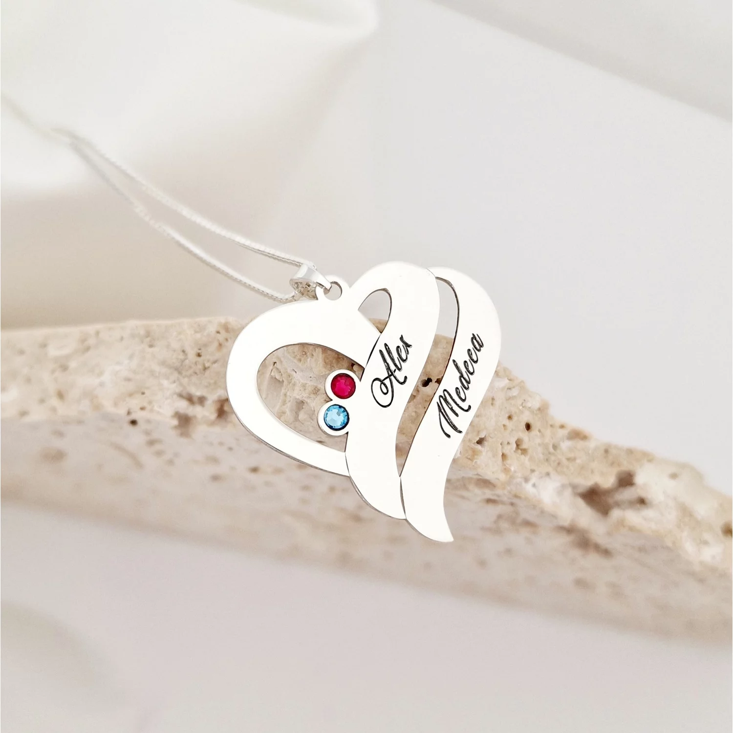 Lantisor personalizat - Iubire nelimitata - Pandantiv inima - 4 nume gravate si cristale Swarovski - Argint 925