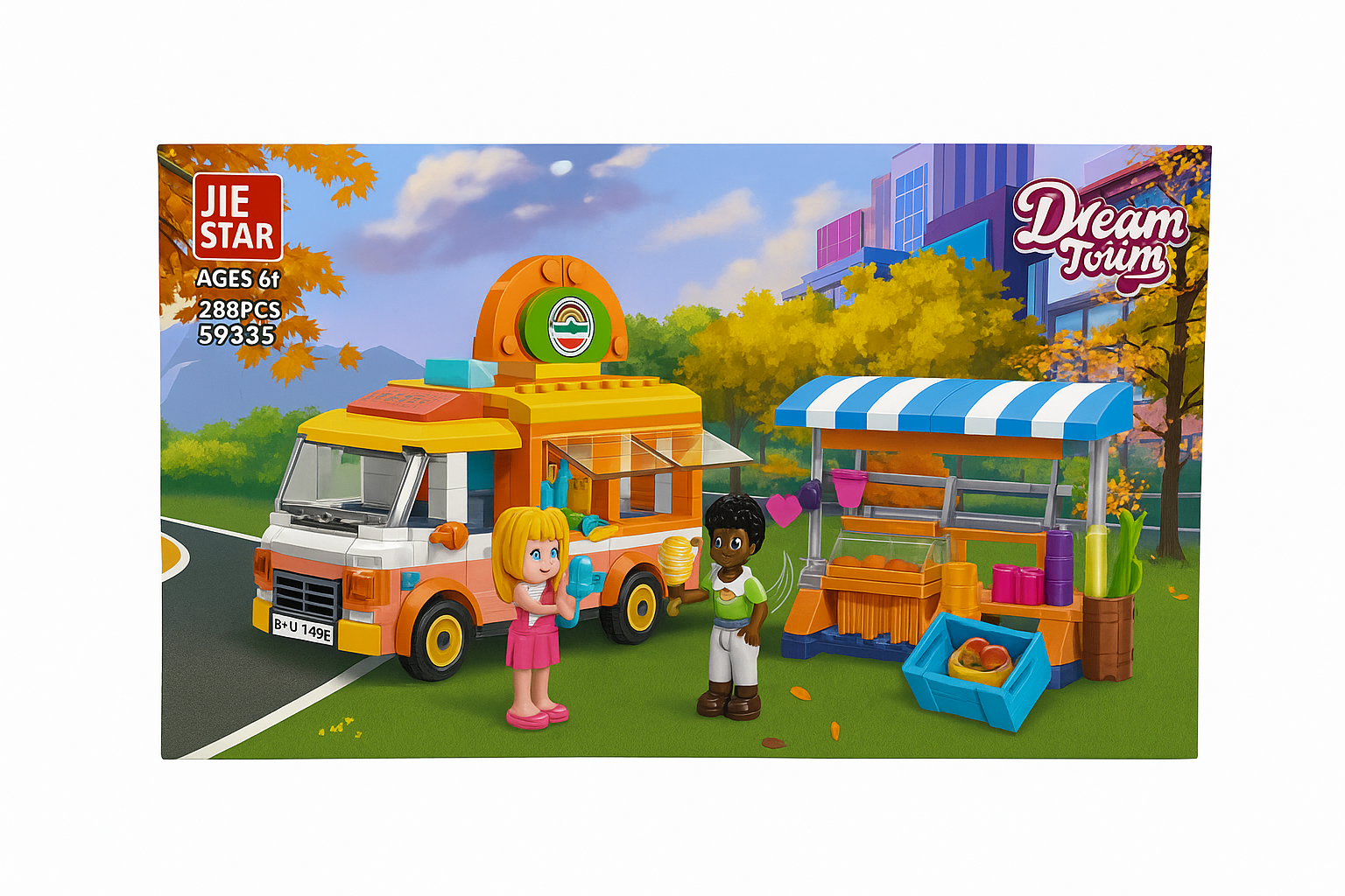 Set Constructie Jie Star Food Truck cu Stand de Fructe - Dream Tour, 288 Piese, 34x21.5 cm, 6+