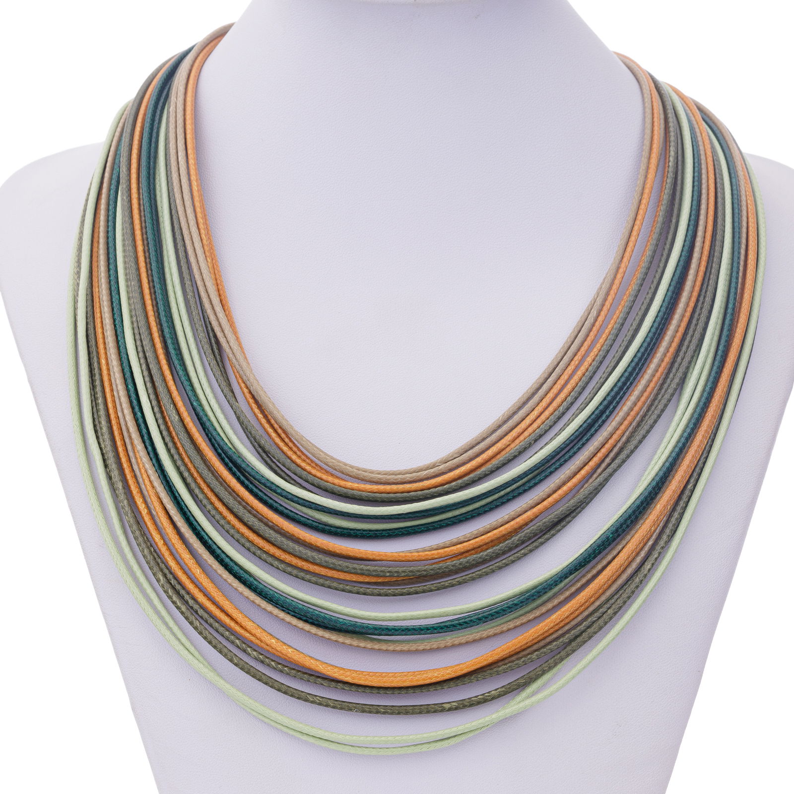 Colier cu multe siruri inegale, cu nuante de verde, mustar, kaki si bej