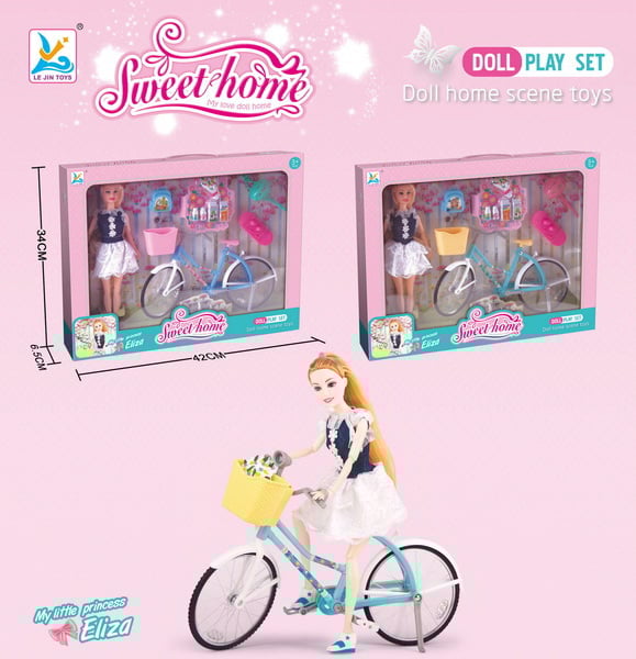 Set engros, papusa cu bicicleta si accesorii, model cu baterii, 42x6,5x34 cm