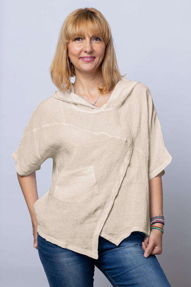 Bluza bej asimetrica din in, cu gluga Talie unica