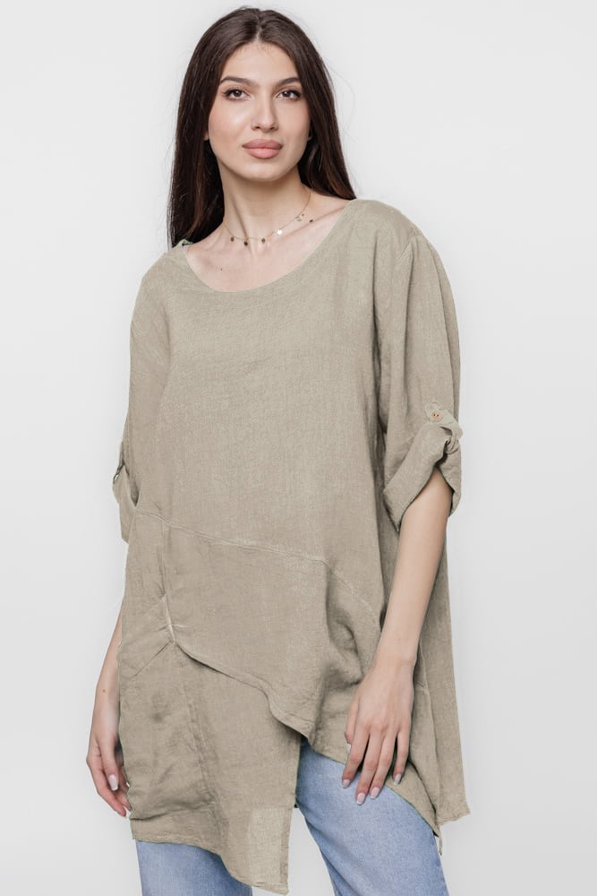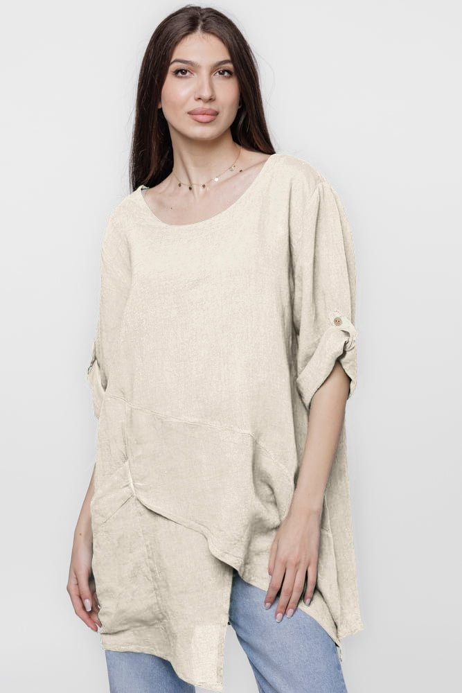 Bluza lunga tunica, in colturi, din in, bej Talie unica