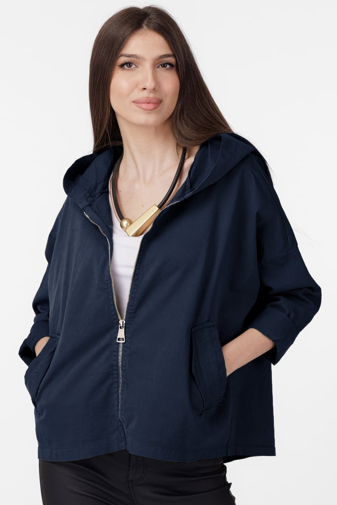 Geaca dama subtire, de blugi cu gluga si despicatura spate, bleumarin Talie unica
