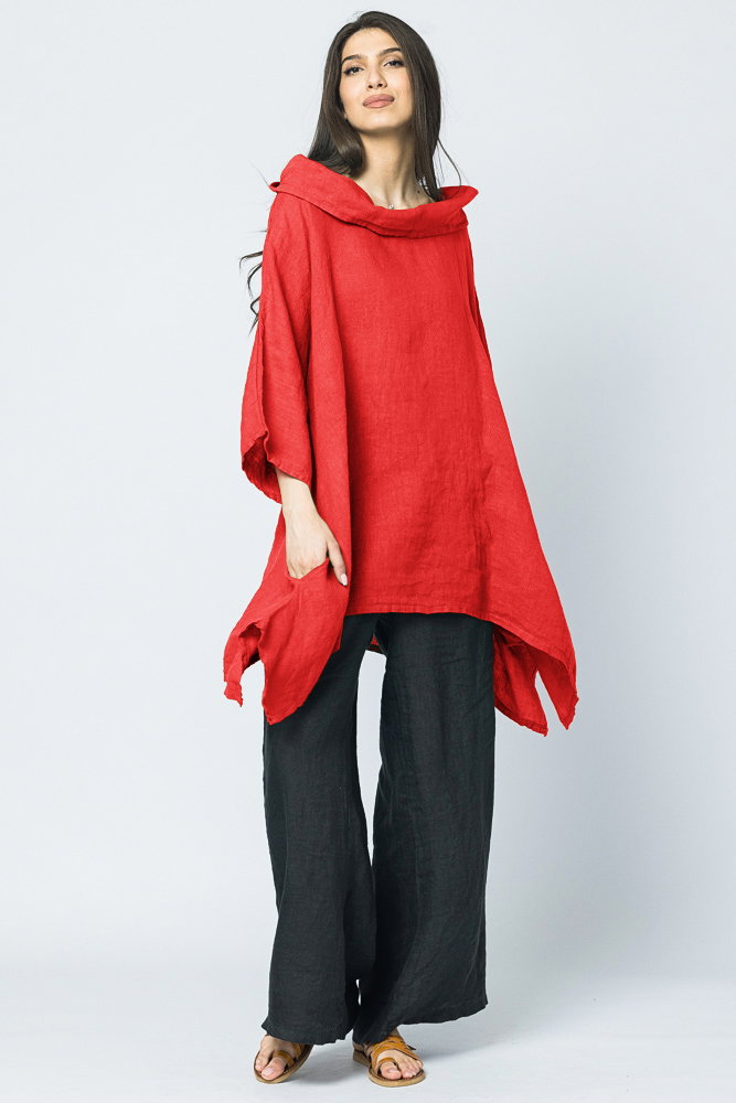 Bluza lunga in colturi, din in, cu gluga, rosie Talie unica
