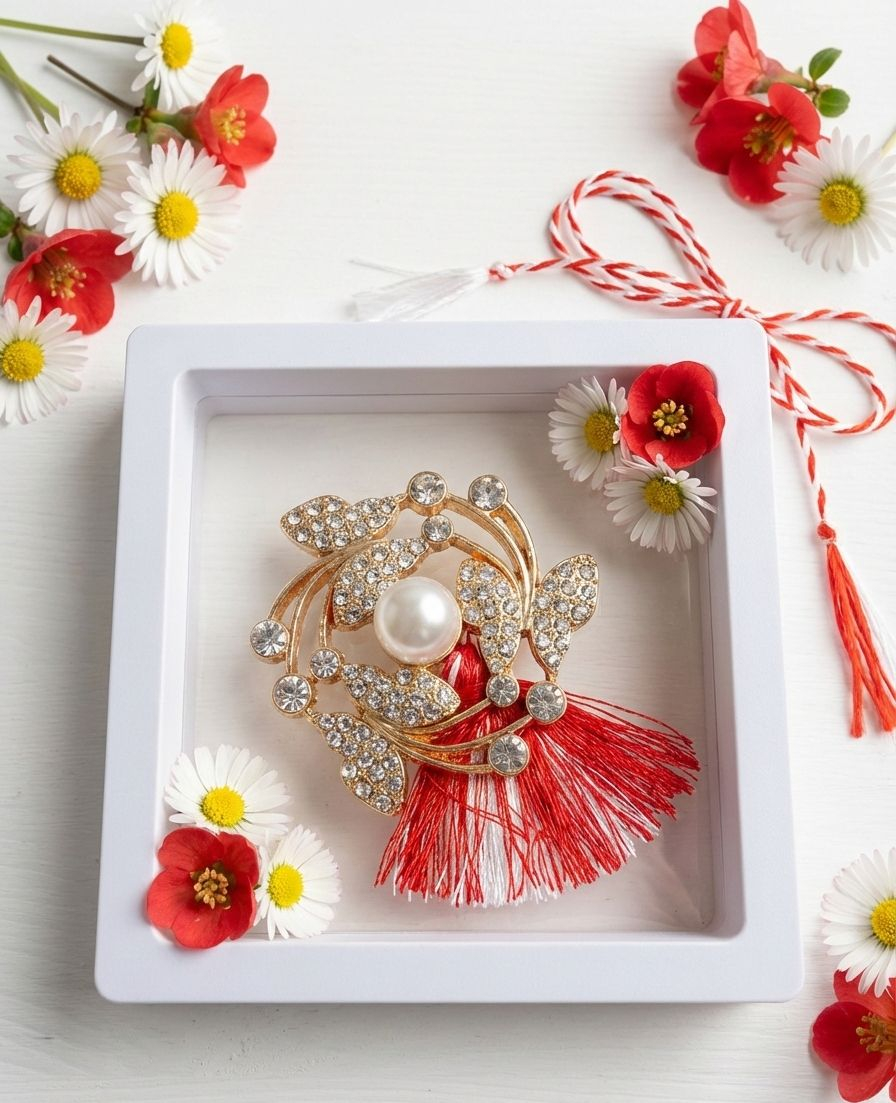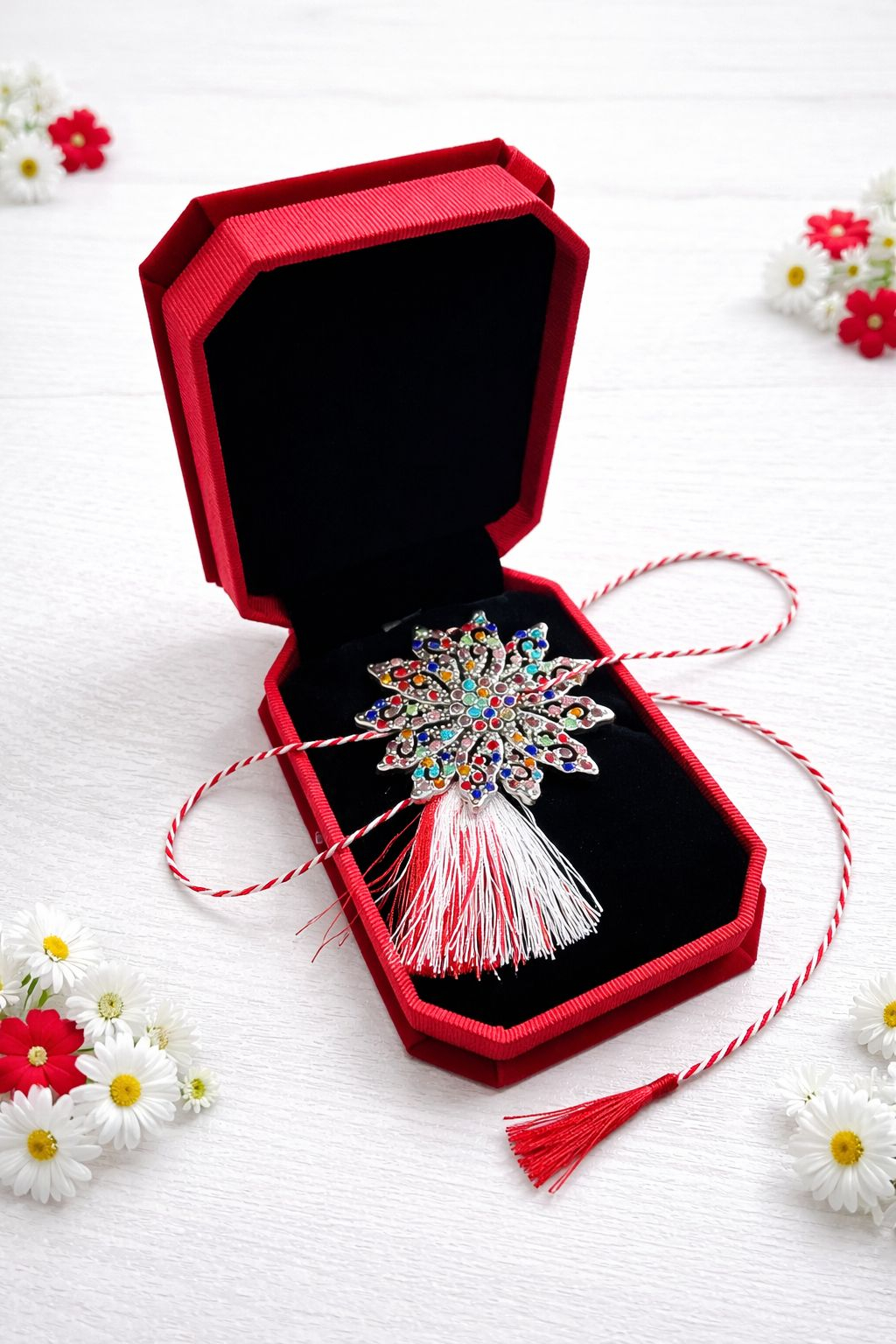 Brosa Floare Martisor cu Strasuri Multicolore in Cutie Cadou Eleganta