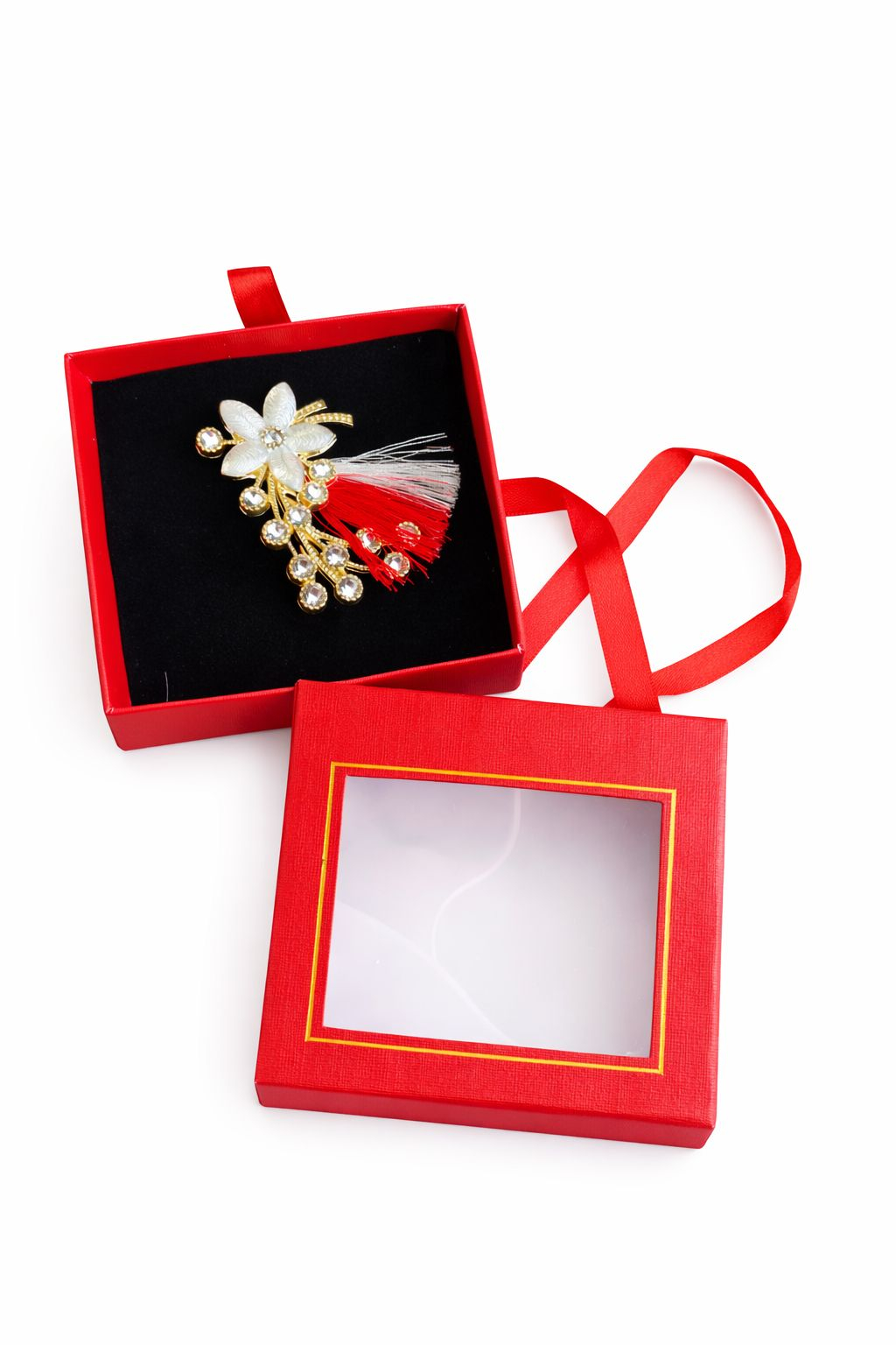 Brosa Martisor 5 cm, Floare cu cristale, in cutie 9x9 cm cu fereastra, cadou 1 Martie