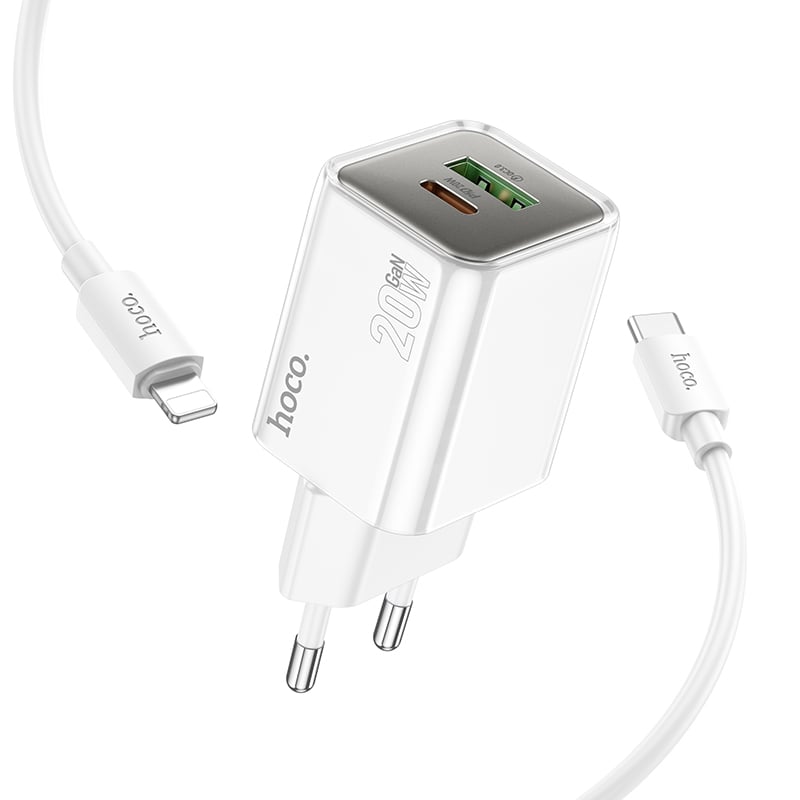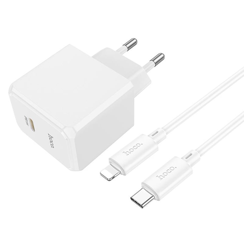 Set Adaptor HOCO N61 si Cablu Lightning, Compatibil iPhone, Incarcare rapida 20W, Tehnologie GaN, Alb Engros
