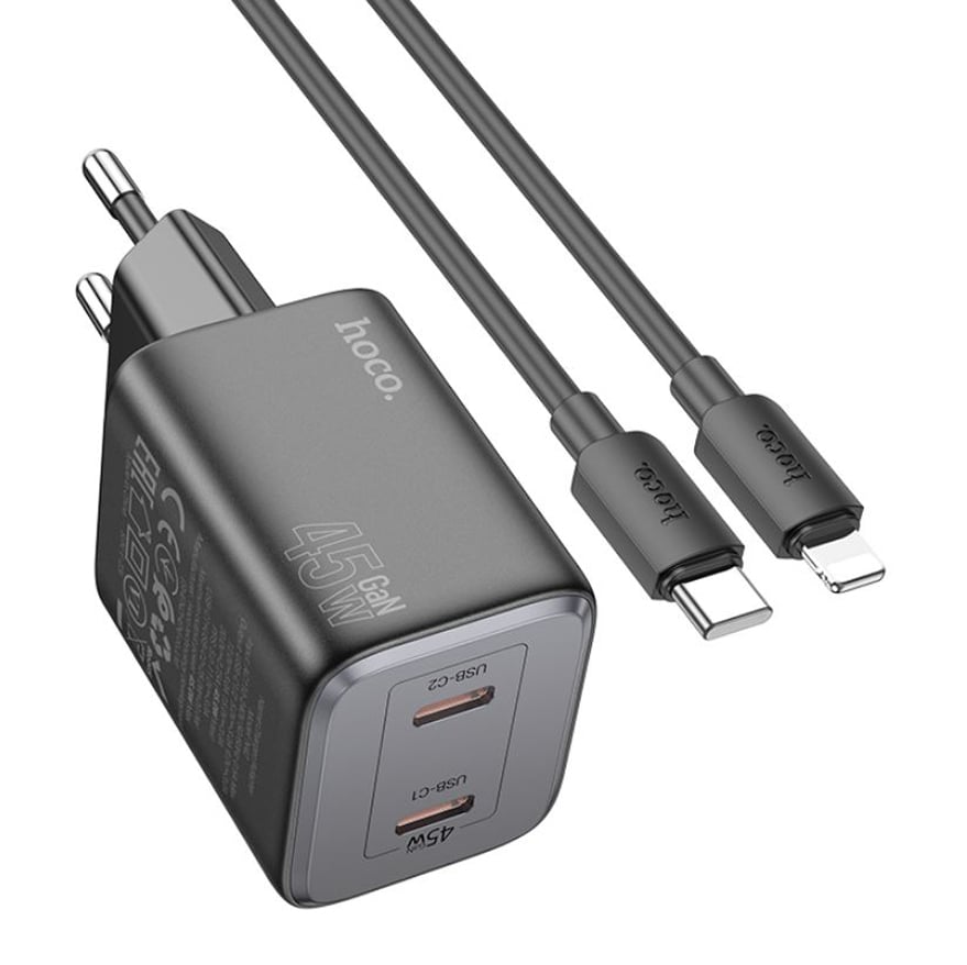 Set Adaptor HOCO N42 si Cablu Lightning, Compatibil iPhone, Putere 45W, Tehnologie GaN, Negru Engros