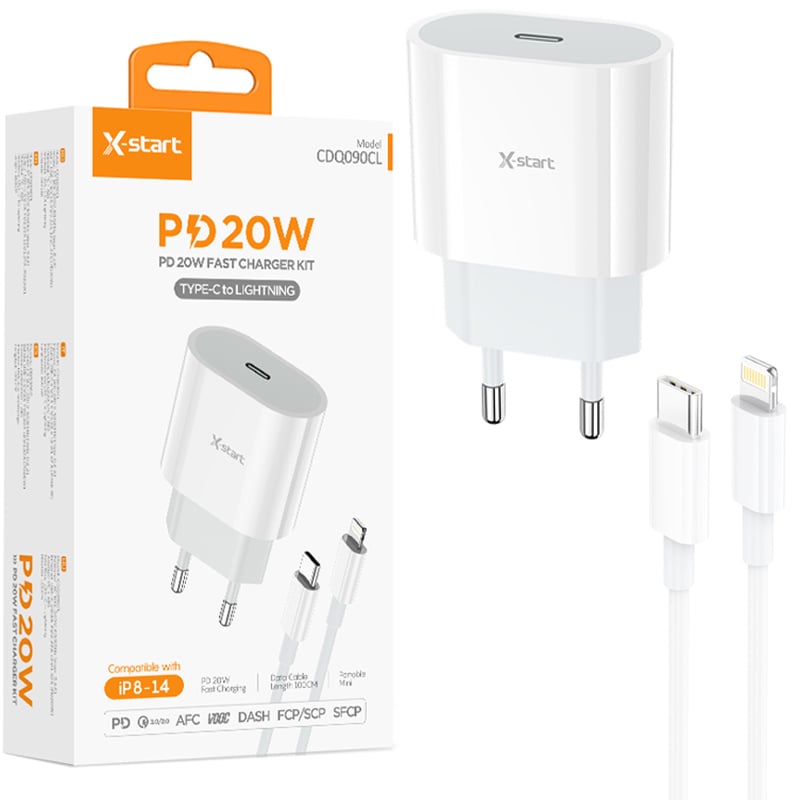 Set Adaptor X-Start CDQ090CL si Cablu Lightning, pentru iPhone, Incarcare rapida 20W, Alb Engros