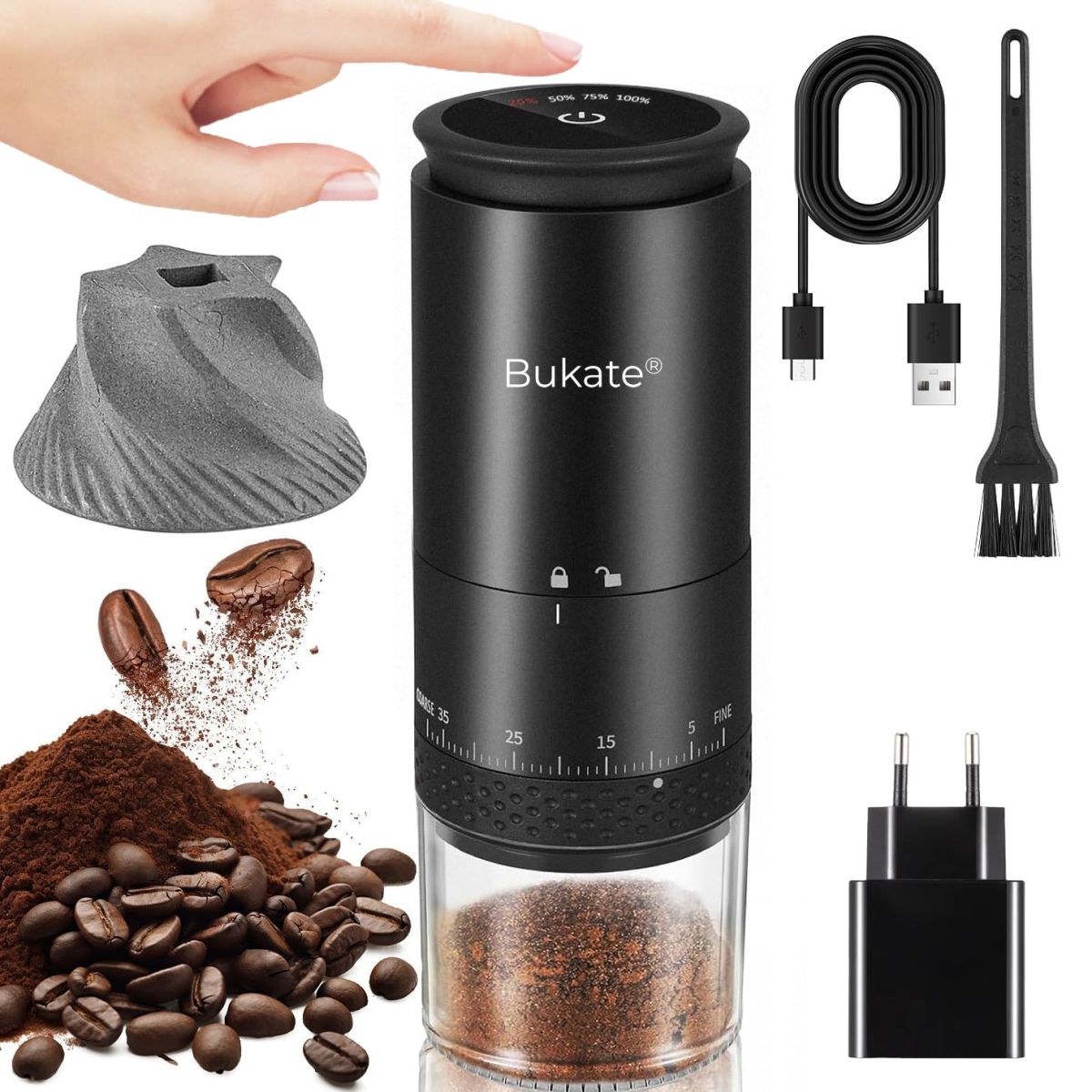 Rasnita electrica de cafea Bukate®, portabila cu discuri din otel inoxidabil, reincarcabila cu 38 de setari granulatie reglabile, pentru espresso, ecran LCD, fara fir cu acumulator, perie de curatare si cablu USB, ideala pentru calatorii si camping, Negr