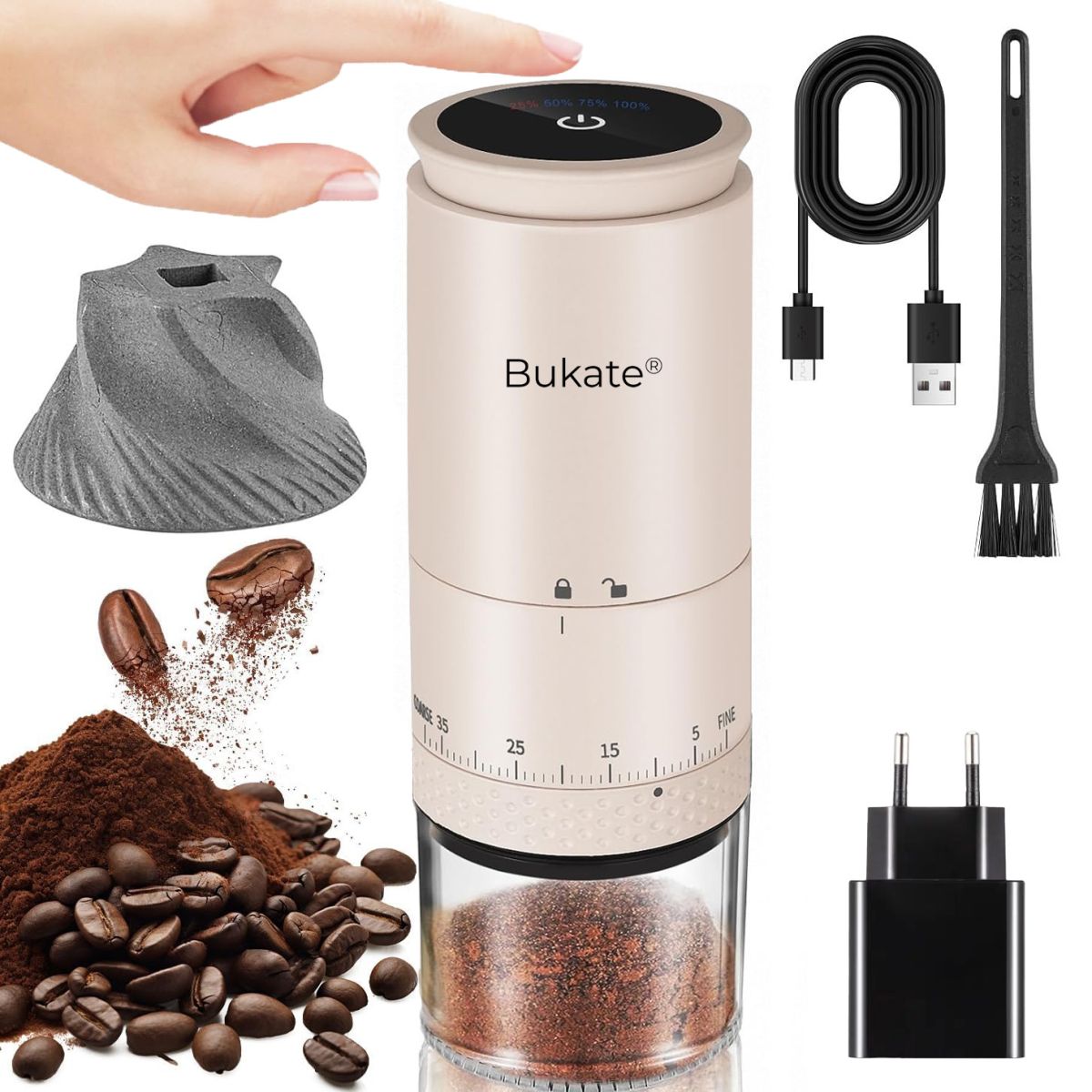 Rasnita electrica de cafea Bukate®, portabila cu discuri din otel inoxidabil, reincarcabila cu 38 de setari granulatie reglabile, pentru espresso, ecran LCD, fara fir cu acumulator, perie de curatare si cablu USB, ideala pentru calatorii si camping, Crem