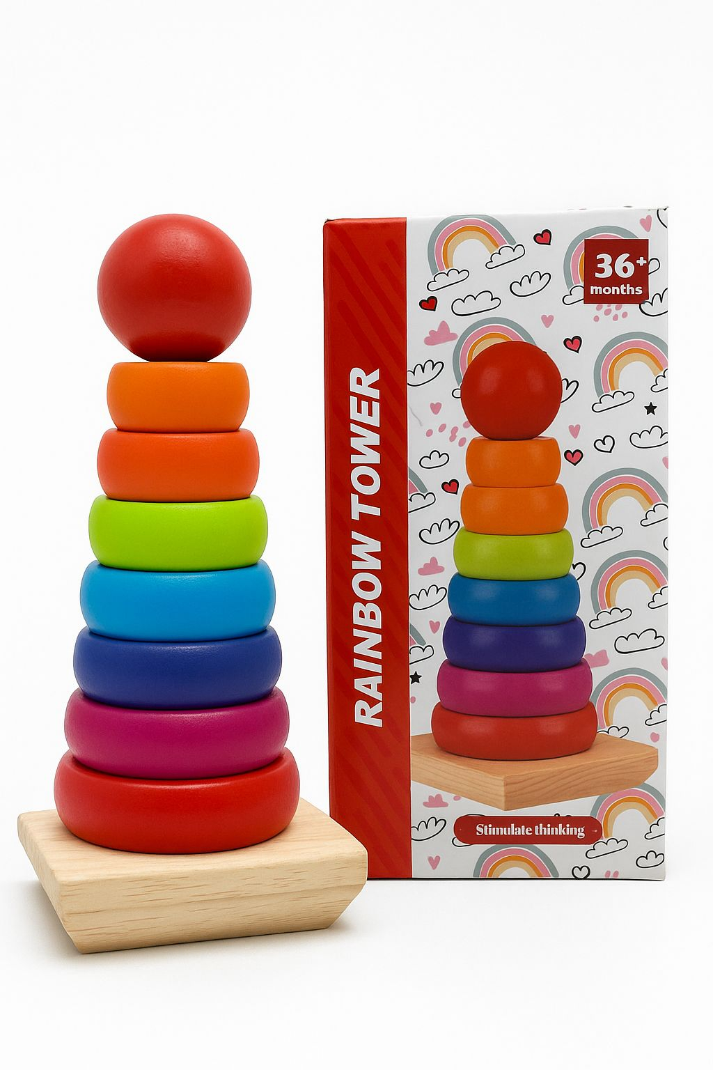 Turn Educativ din Lemn cu Cercuri Colorate - Rainbow Tower, 19x9.5cm