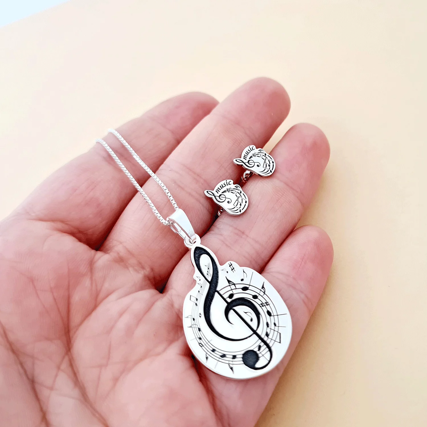 Set personalizat lantisor si cercei - Cheia Sol cu portativ si note muzicale - Argint 925