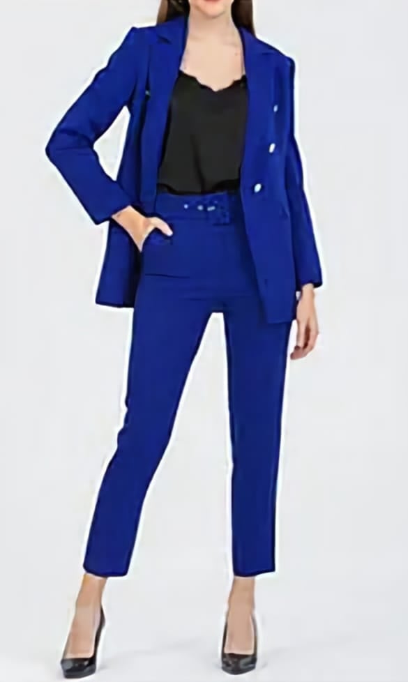 Costum business KARMIA, cu vesta accesorizata si pantaloni largi, Turcoaz, Marime S/M