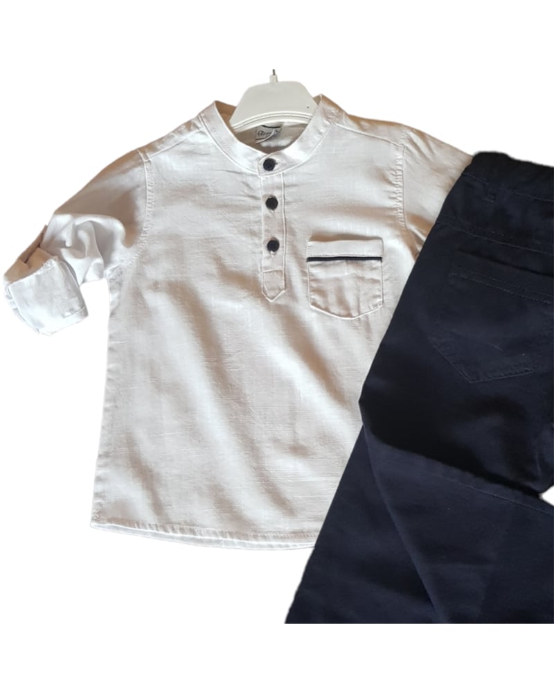 Costum baietei, Engros, Serie mica, camasa alba stil tunica si pantaloni bleumarin