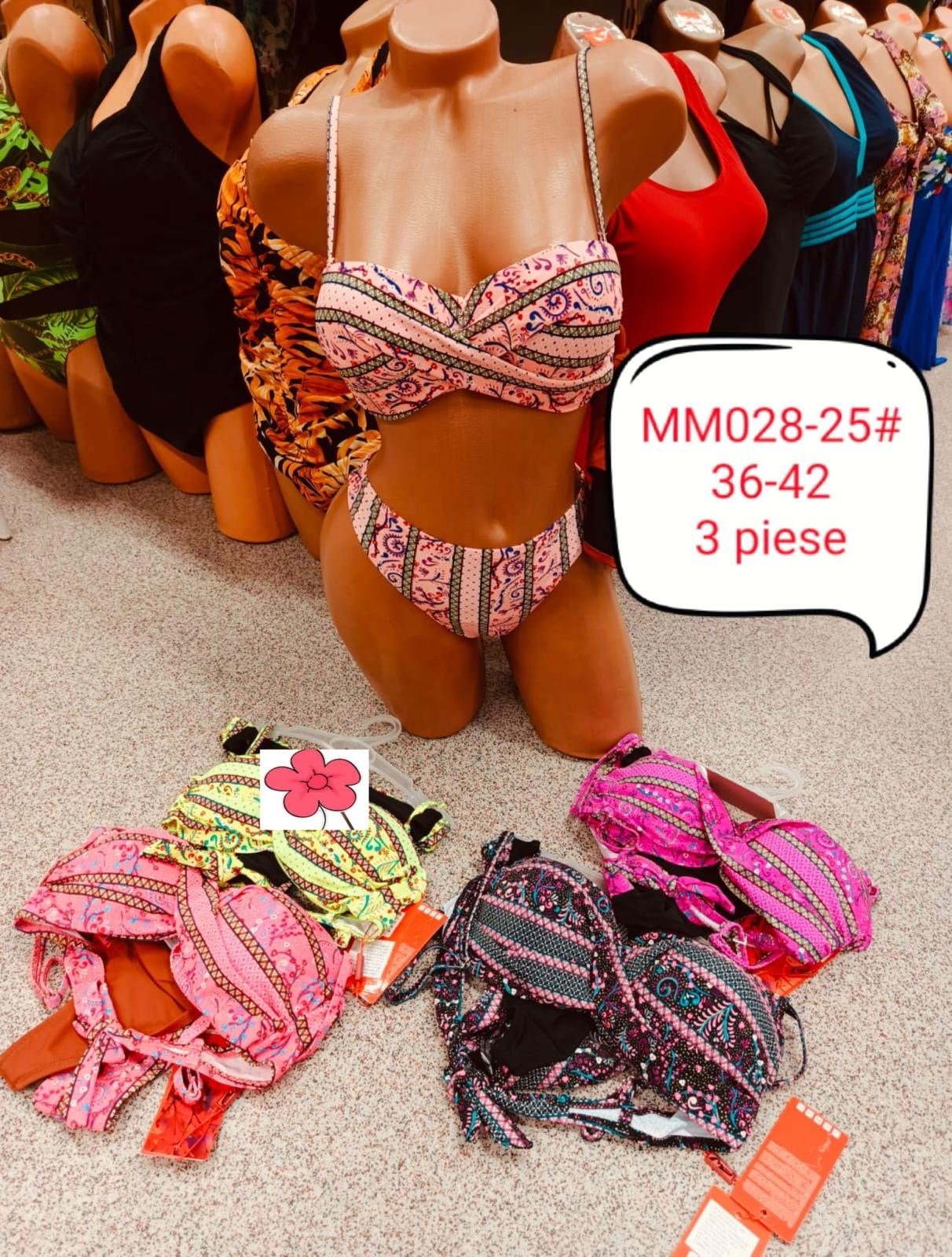 Costum de baie DAMA, 3piese, Cu Pantaloni, Engross, marimi 36-44, 5buc/serie, Slip Brazilian, Sutien cu burete detasabil, Roz