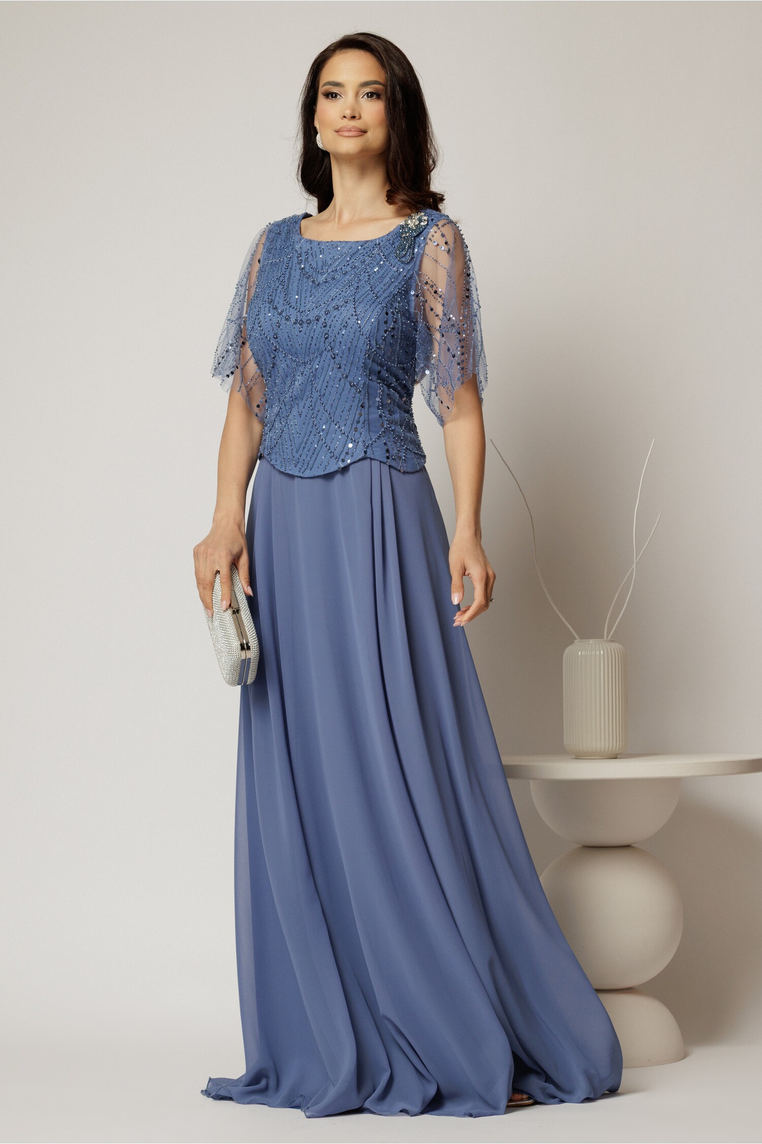 Rochie lunga bleu de seara din voal si aplicatii de paiete la bust
