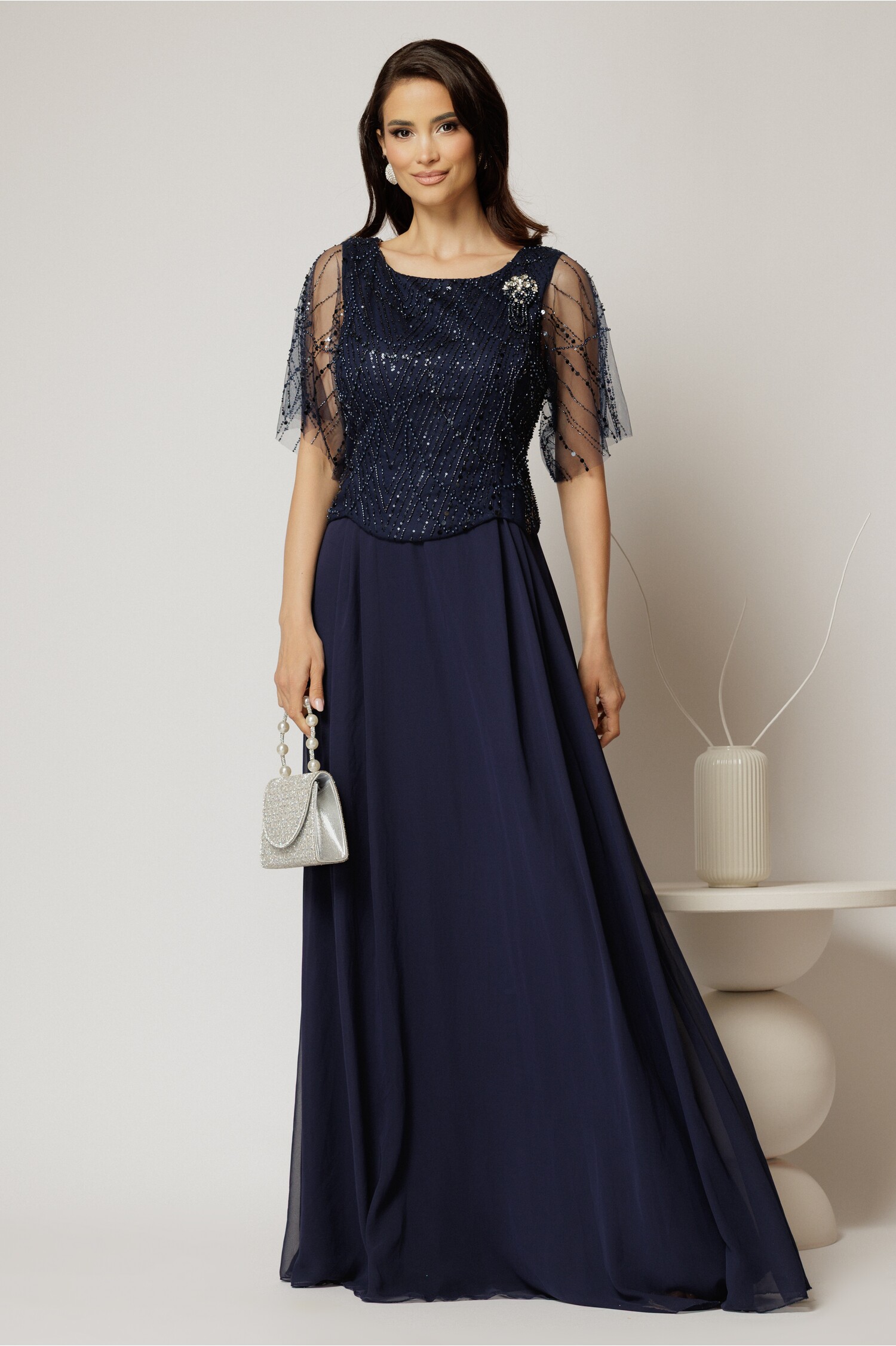 Rochie lunga bleumarin de seara din voal si aplicatii de paiete la bust
