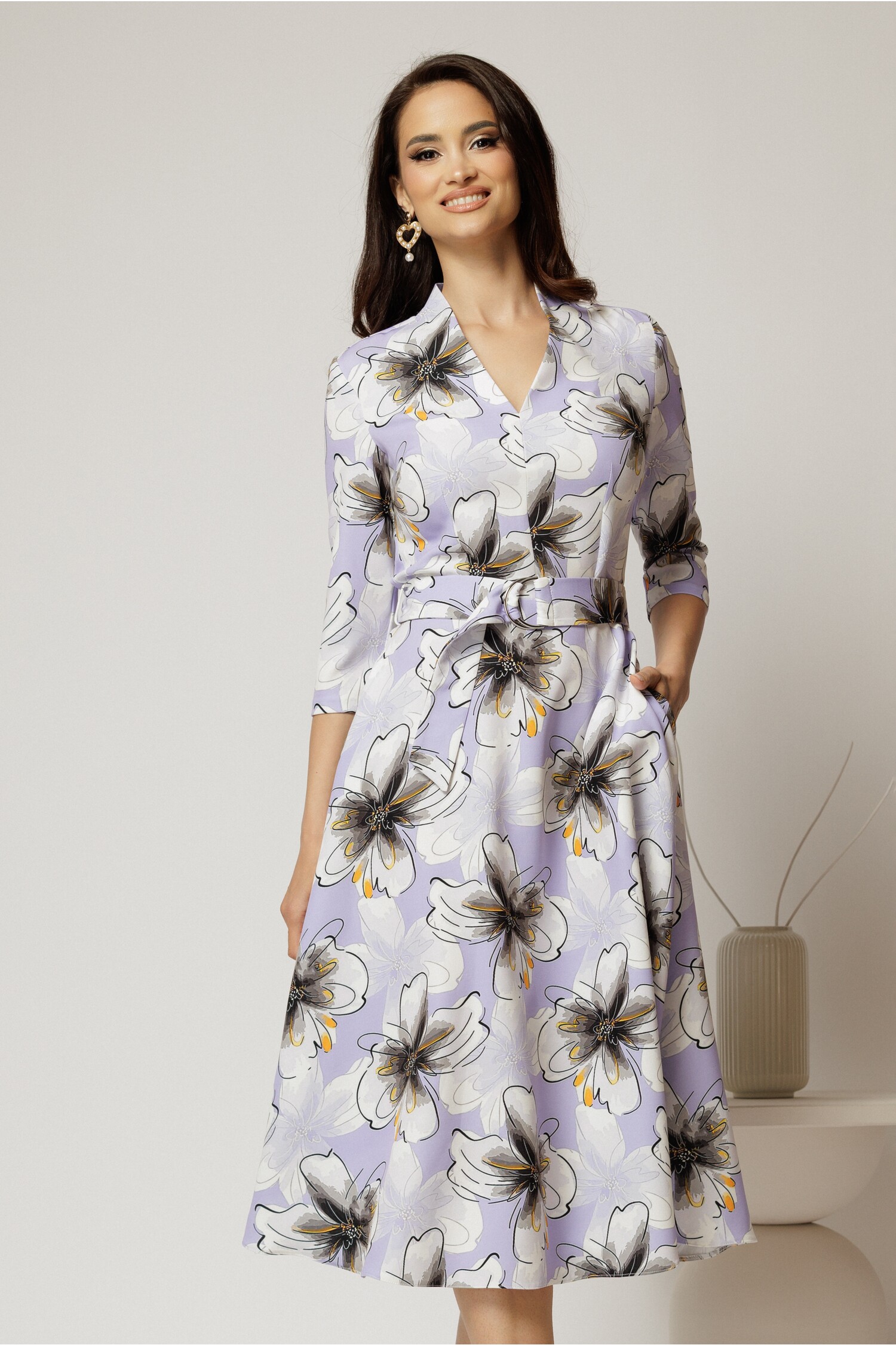 Rochie midi de zi lila cu imprimeuri ivoar cu buzunare
