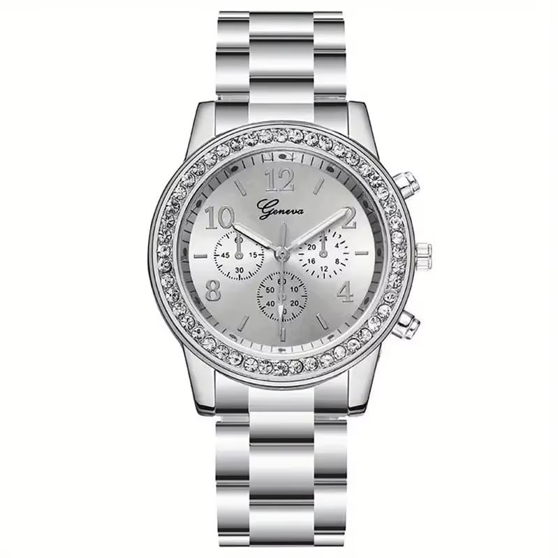 Ceas Classic Crystal, pentru Femei, Geneva, Cristale zirconiu, Quartz, Curea metalica, Argintiu Engros
