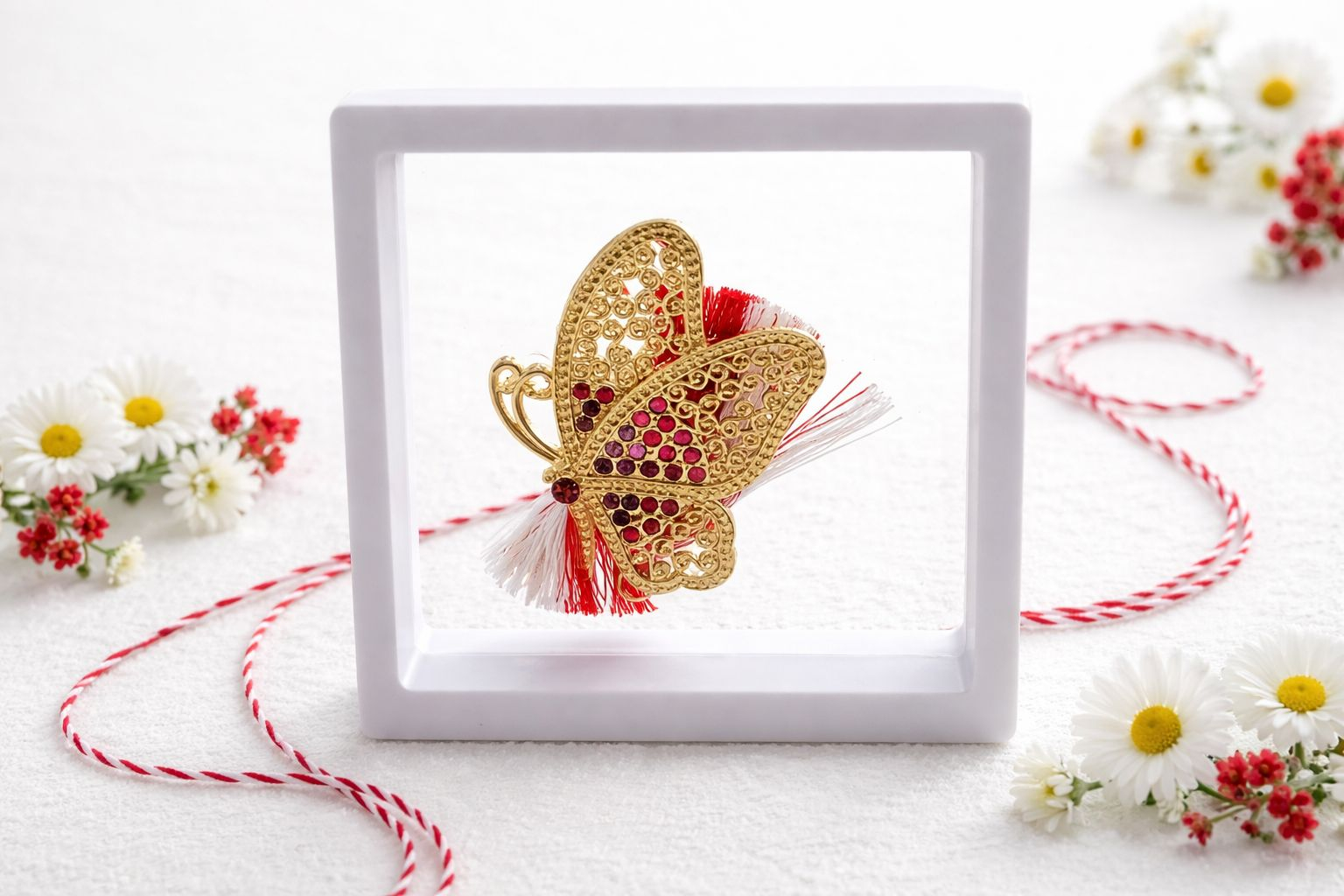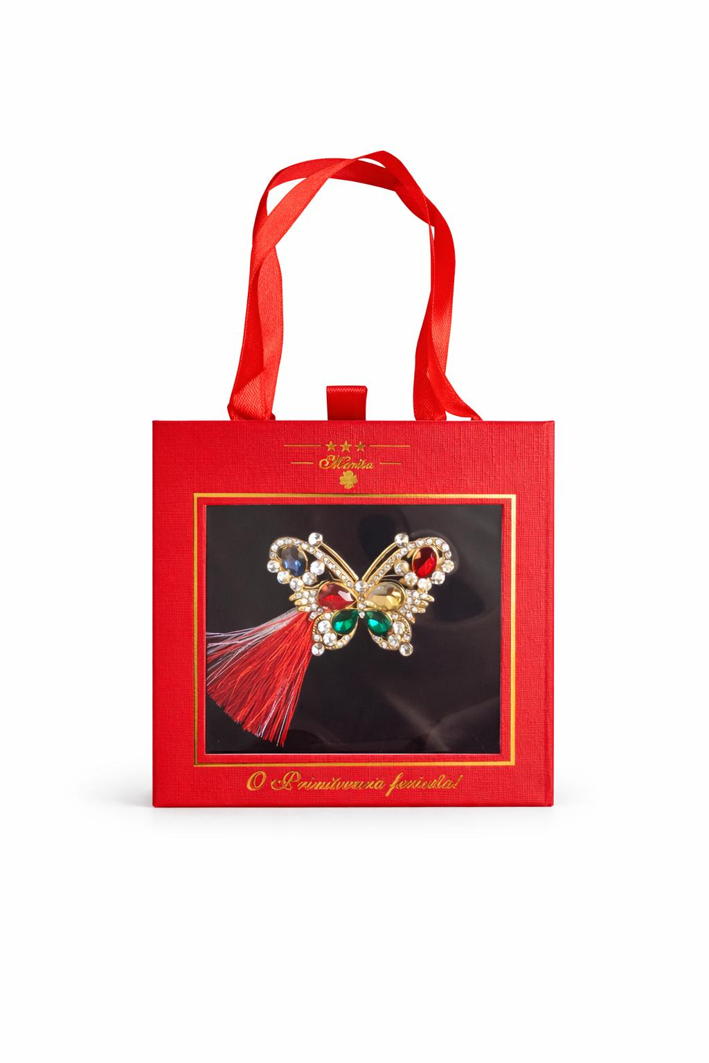 Brosa Martisor 5cm, Fluture pretios, in cutie gentuta 7x7 cm cu fereastra, cadou 1 Martie